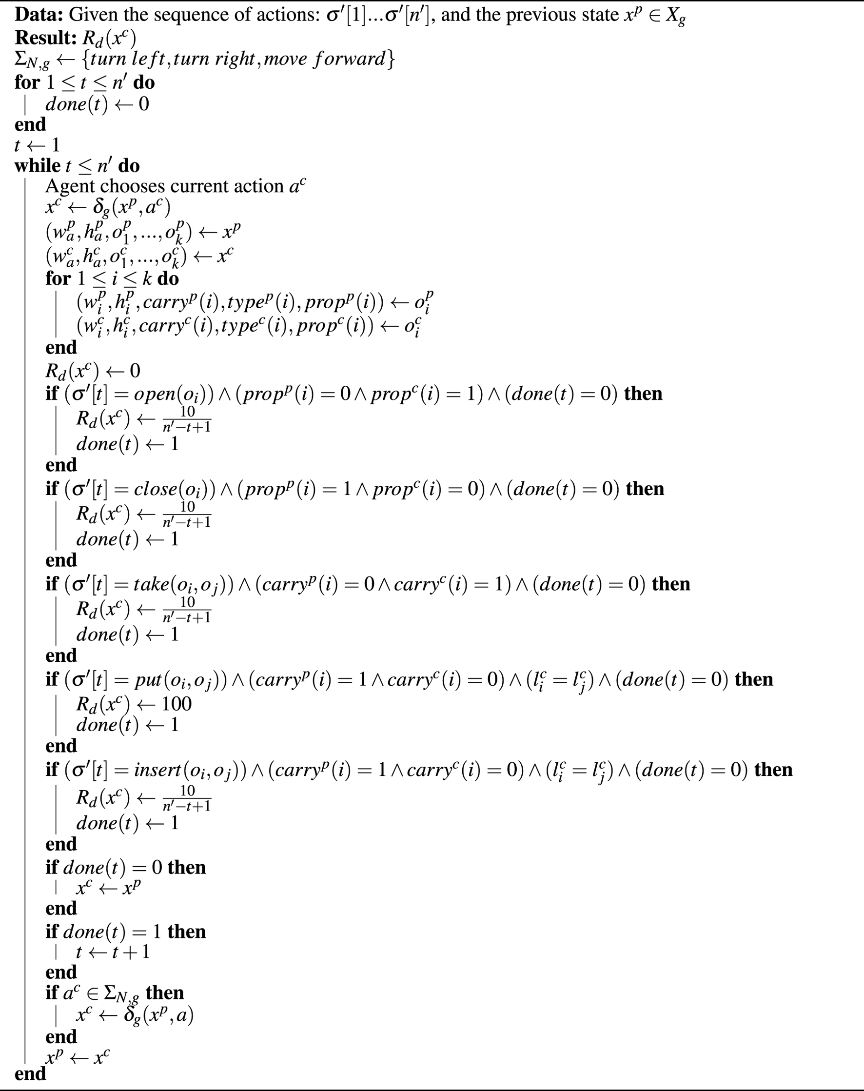 Conventionally, the mapping of the user command to robotic actuations that the different tasks are comprised is done within a neural network (NN) which is trained via reinforcement learning (RL)1. The NN, given the input, the user command, and the state it is currently in, would output the actions to perform in the current time step. If the actions performed led to a positive reward, the weights of the network would be altered in a way that “reinforces” those actions. In other words, as long as we can map the user commands to rewards for specific goal states, NN will learn the mapping of its input (state + user command) to its output (current actions to take) in order to reach those goal states. For example, considering the previous command “bring the water bottle,” the goal state would be the agent holding the water bottle in front of the person who asked. Automatically assigning rewards to goal states based on the user command is one problem. However, despite assuming we have a module that does this, there is still the problem of sparse rewarding remaining, i.e., before the NN is trained, it takes random actions (exploration), and due to the complexity of the environment, it might never (or very rarely) reach the goal-only sparse reward and, therefore, might never (or very poorly) learn the correct actions. Furthermore, it is important to note that, in our workspace, in most simulations and in the real world, the agent needs to have the right orientation and location before choosing the right pick/place or open/close action. Therefore, even a simple space of 6 × 6 cells in a grid environment (see Figure 4) can lead to a high number of reward-less actions before the agent is rewarded, which can result in extreme slow learning. Overall, robotic tasks tend to prove hard in terms of constructing a reward function due to complex state space representations and usually demand a human-in-the-loop approach (Singh et al., 2019). This has been well-documented in the literature (Kober et al., 2013) and results in sparse rewarding (Rauber et al., 2021; Rengarajan et al., 2022) or even the binary goal reward (1 if the goal state is reached and 0 otherwise). The same is true in the case of embodied AI. Hence, dense rewarding is desirable. We show that reward assignment in such cases can be simplified with task decomposition by implementing an approach that tackles these problems. Using formal methods, we guarantee it can reach solutions, and we present proof-of-concept examples and environment testing.