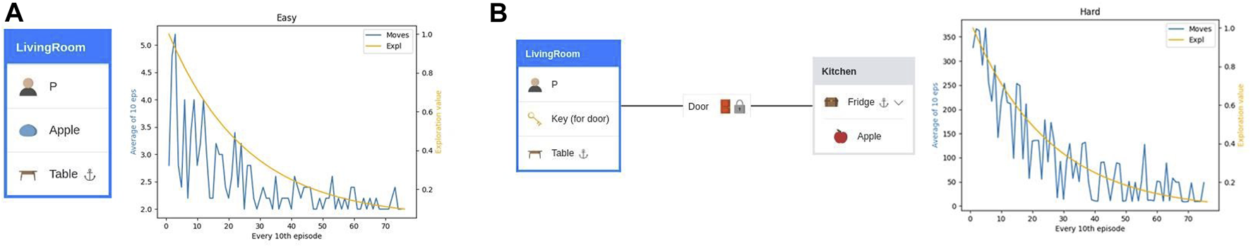 Starting with Table A1, the goal state is defined by the user_input, which is the same for all levels of difficulty and equal to the string “put apple on table.” The rest of the variables were tuned empirically in order to see convergence in all TW training examples. Here, we use the term “epochs” for nothing more than the total of 150 steps. Therefore, five epochs of the 150 steps mean a total of 750 steps, which was the minimum necessary number of steps in order for the algorithm to achieve the optimal result. The value 0.004 of the exploration decay rate (expl_decay_rate) ensured that by the end of the training for any of the tested environments, the agent reached the minimum exploration value (min_expl) of 0.05 and, therefore, relied mostly on the learned policy. The min_expl value was not chosen to be 0 in order to allow deviations from the learned policy and potentially discover better routes. This is a common practice during training RL agents. It is also common to use a high value for the discount variable gamma but less than 1 since the future reward is less valuable than the present reward.