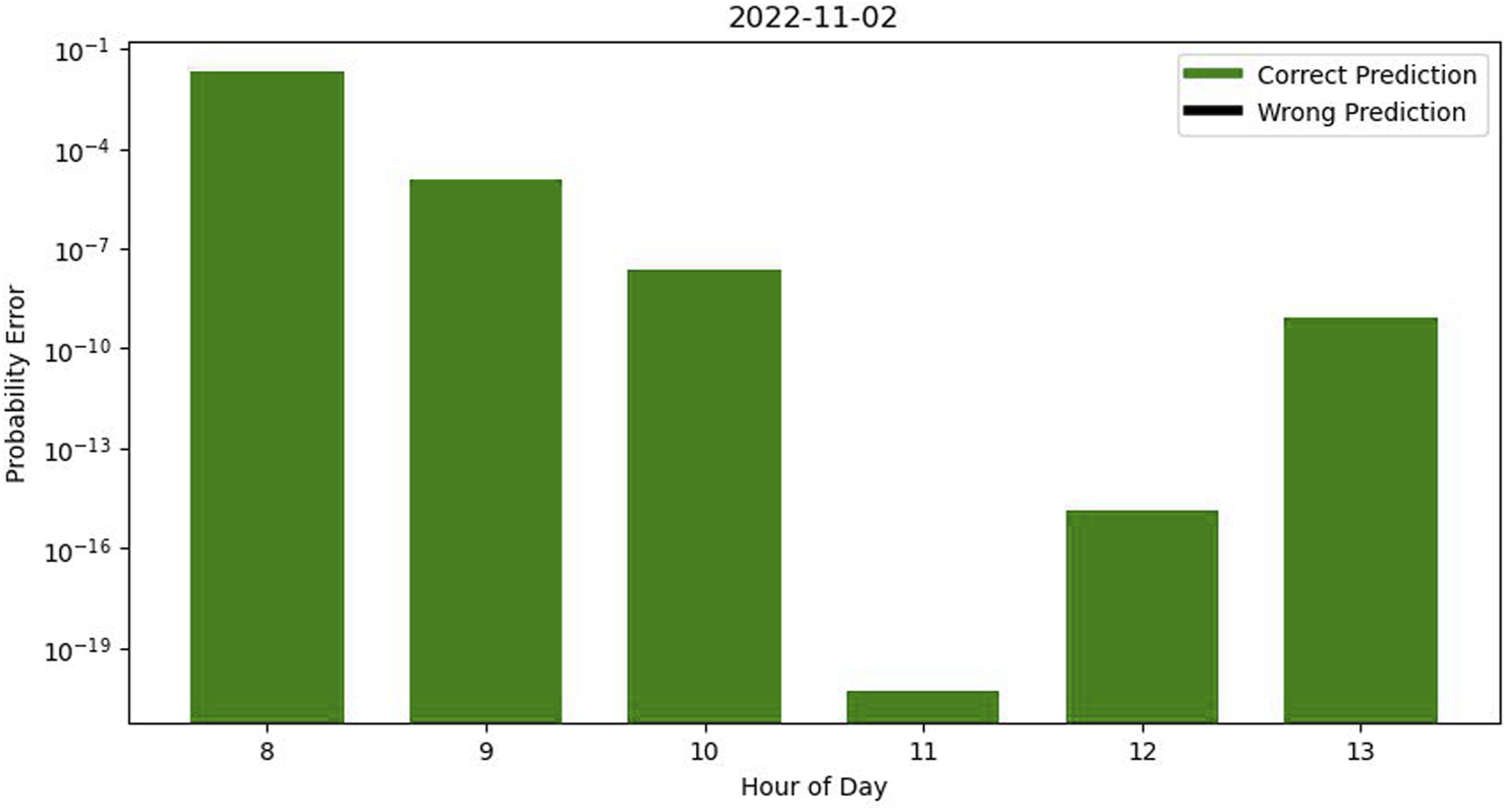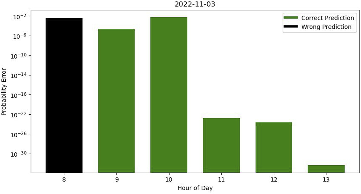 If we aggregate the results on a daily basis by dividing each day into six testing sets spanning from 8 a.m. to 2 p.m., we can generate a graph to evaluate the accuracy and assess probability errors. For instance, on 2022-11-03, as illustrated in Figure 3, certain probability errors exhibit significantly smaller magnitudes than others. The lower range of these errors enhances the robustness of our prediction accuracy.