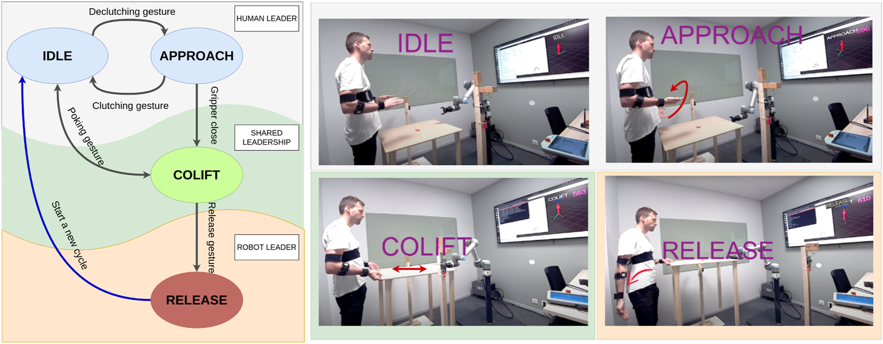 HRC roles and states in the experimental co-lift scenario. Human Leading role has two states: IDLE: Both chest-to-wrist (hand) motions are actively calculated yet no motion command is sent to the robot. APPROACH: Combined (merged) pose from two hands is actively calculated to produce soft real-time end-effector goal pose commands. The robot follows the human actively. Shared Leadership role has one state: CO-LIFT: The robot applies a directional compliant force and the human decides the direction of this force with elbow gestures. Robot Leading role has one state: RELEASE: The robot takes the lead in the operation, and moves to a predefined release pose. The human follows the robot’s motions. The steering arm is assigned for transition gestures and the red arrows show the respective transition gestures between states. Rotating the right palm up/down is assigned as the de-clutching/clutching gesture, clenching the right fist is the gripper close gesture (not highlighted in the fig.), pushing/pulling the table is the poking gesture, and releasing the right arm down is the release gesture.