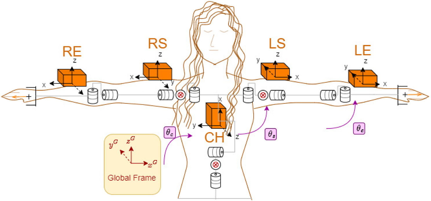 With this model, we measure 13 degrees of freedom (DoF) upper-body motions including the chest, upper and lower arm motions on both arms but neglected the wrist motions. Our human model is a collection of estimated individual joint angles, where a joint angle can be found by calculating the rotation between two consecutive links with attached IMUs. The kinematic chain for such a human model from the base (chest) to the tip (left hand) can be written as: