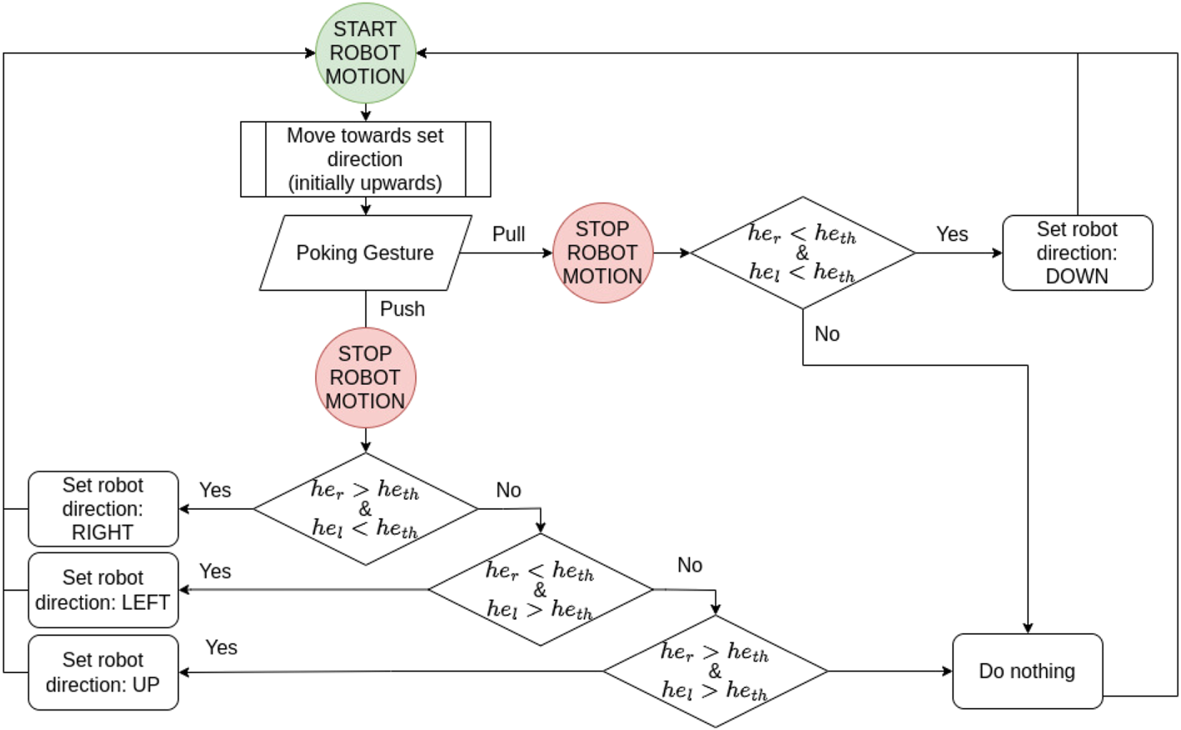 When the human and the robot are both in the leadership role (i.e., carrying the object together, defined as COLIFT state in Sect.2.1) the predefined command cooperation method is applied. There the human uses elbows to show the direction where the robot should go with a poking gesture (i.e., by pulling/pushing the object). The motion type is predefined such that the robot goes upwards, downwards, left and right in the xz-plane. The flowchart of how the predefined command cooperation in the active lifting phase is implemented is given in Figure 4.