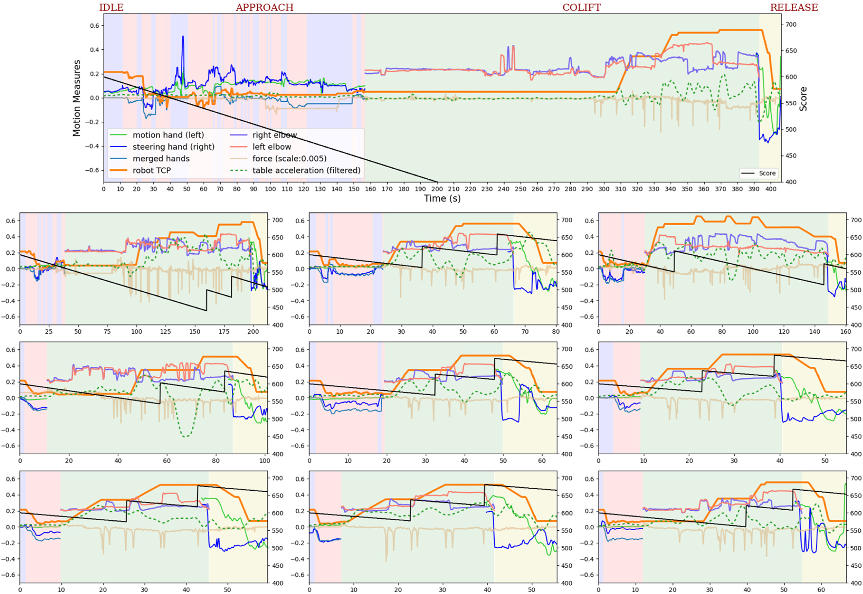 The figure shows the experimental measurements of user ID:35,764 during the 10 trials. The largest figure on the top is the first trial, and the rest of the trials are presented row by row from the top left to the bottom right. The experiments start with the IDLE state highlighted with purple background colour, followed by the APPROACH, COLIFT, and RELEASE states, which are highlighted with pink, green, and yellow background colours, respectively. The user’s two hand motions, calculated merged hands motion, and two elbow heights are measured from the participant’s side. The hand motions are visible shown in the IDLE, APPROACH and RELEASE states, and the elbow motions are shown only in the COLIFT state. The end-effector (TCP) motion and the exerted force are measured from the robot’s side, and the table acceleration and user score are measured as training parameters.