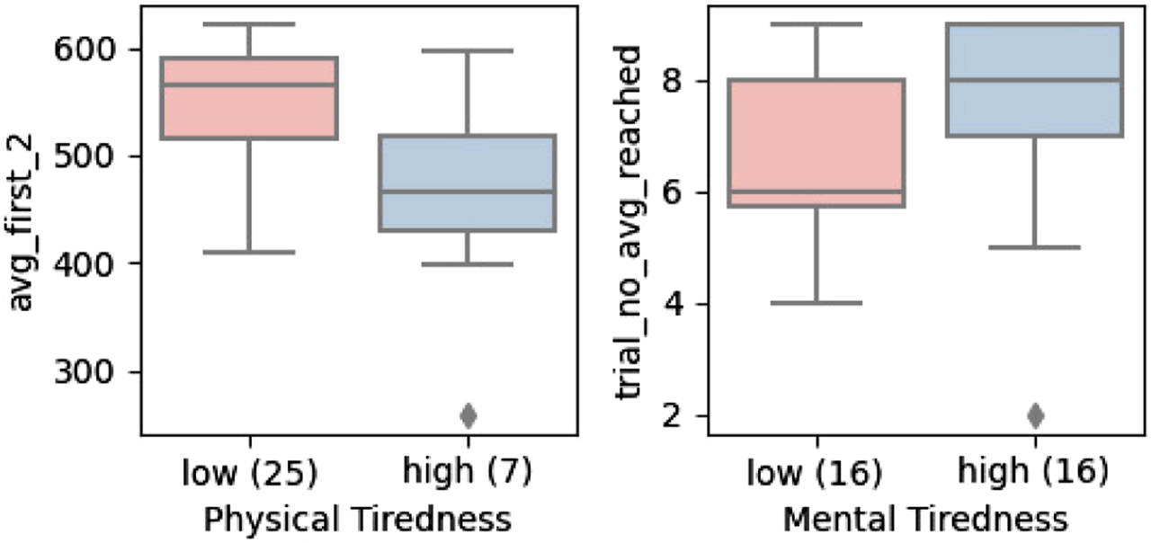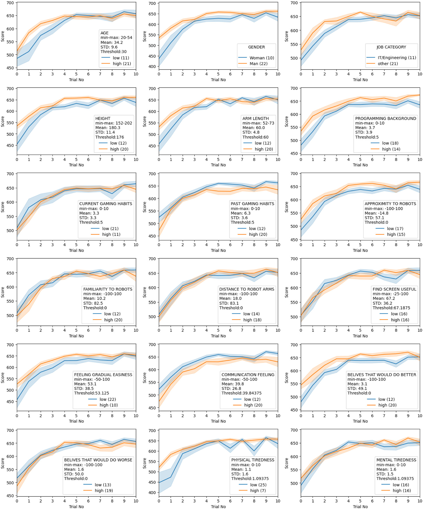 To analyse if any background factors played a role in how well users can learn to cooperate with robots, we divided participants into two samples based on the survey responses. For the gender and job category, the samples were Woman - Man and IT/Engineering - Other. For other categories, samples were divided into Low - High based on the numerical selection on the scale in the respective survey question. For the majority of the categories, the integer mid-point of the Likert scale was selected as the threshold for dividing into samples. However, for some questions, the participants’ answers were weighed on only one side of the threshold such as for physical tiredness and mental tiredness, and we used the mean of the answers instead of dividing participants into two samples.