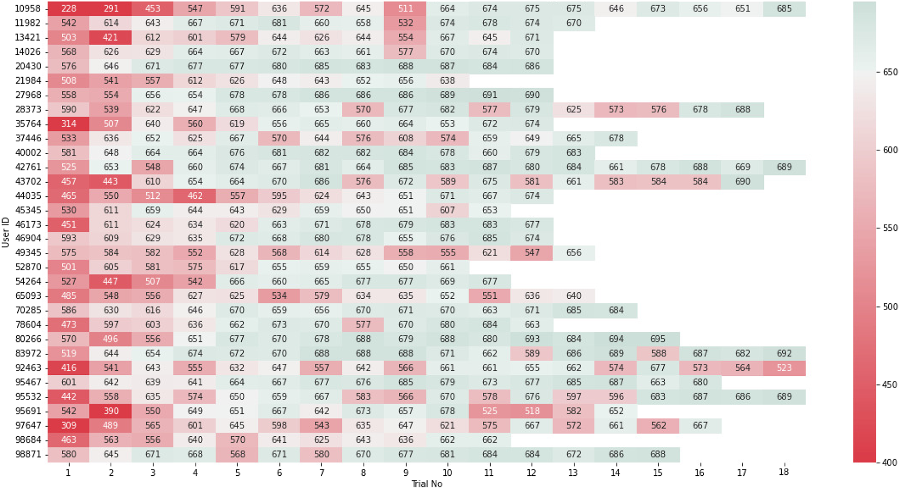 FIGURE 8. User score data on each trial. The results are colour-coded from red to green to visualize the training results from low to high.