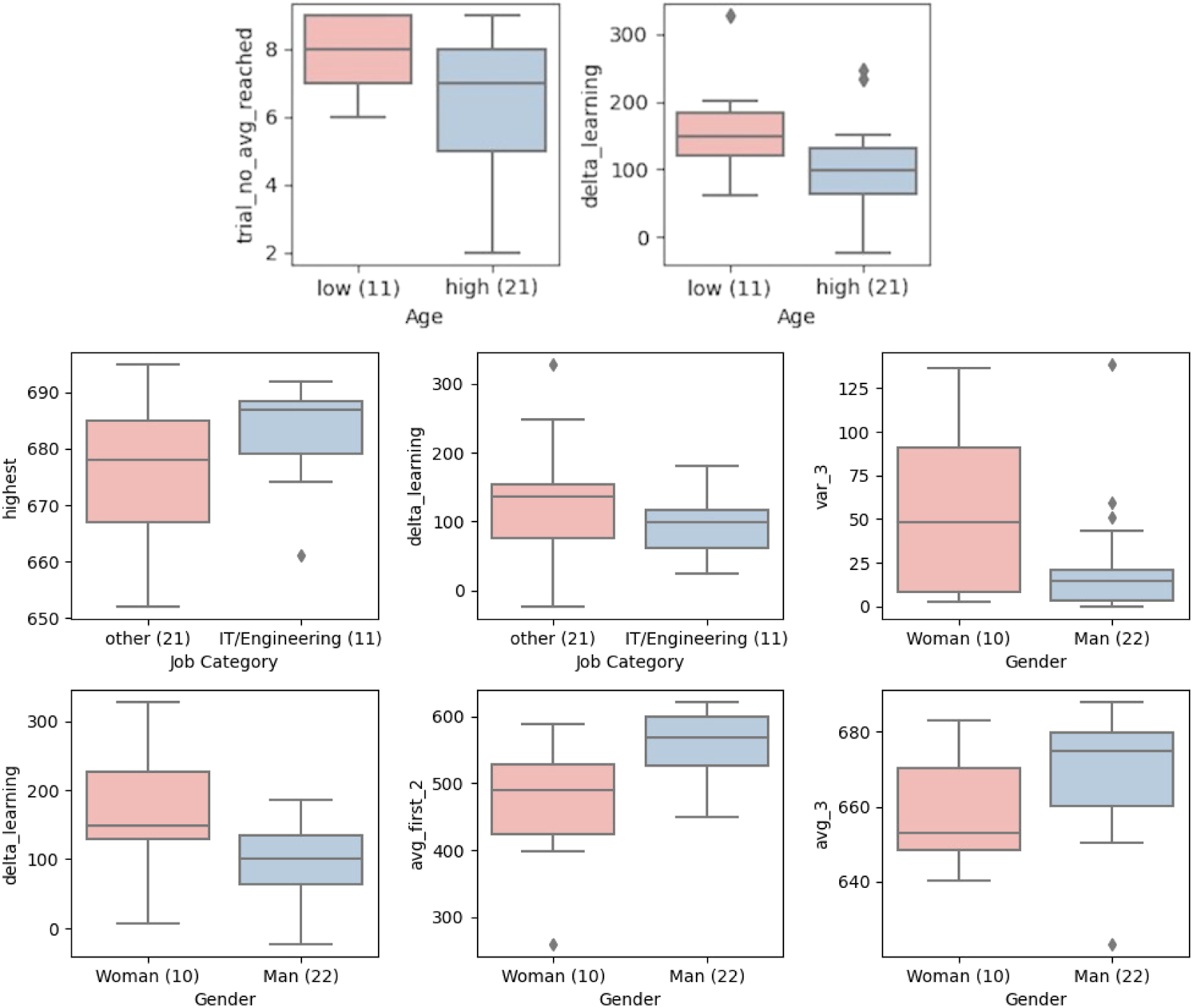 Job category and gender should be looked at together because these two parameters are highly dependent on our group of participants. We registered people from 5 job categories; IT/engineering, health, craft, non-technical office job and unemployed. We analyzed data to see if IT/engineering-related jobs outperformed other jobs grouped together. Unfortunately, there were no women participants enrolled in IT/engineering jobs in the participant group, and thus the job category and the gender factor became indistinguishable in the learning criteria. From the analysis, we see that participants from IT/engineering jobs achieved significantly higher scores than other jobs. The amount of learning (delta_learning) among men was also lower compared to the amount of learning among women. Although the baseline (avg_first_3) of men were higher than women, and women learned more delta_learning, men seem to learn enough from their baseline so that the difference in the average of highest 3 scores avg_3 is also significant in favour of men. Except for 3 outliers, men performed more consistently than women (See (var_3)).