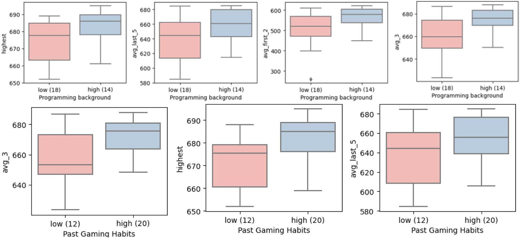 The programming background seems to be advantageous both for the baseline (avg_first_2) and for getting higher scores (highest, avg_last_5 and avg_3) as shown in Figure 12. The current gaming habits do not seem to be a significant factor, which aligns with another relevant study in the literature (Tanaka et al., 2016), whereas past gaming habits seem to be advantageous in the same 3 learning criteria as for the programming background. We can note that the 3 users who were actively playing video games reported some confusion about the motion directions of the robot during the experiments. They reported that the mirrored motion of the robot was confusing since they were more used to a third-person or first-person view of controlling avatars. On the other hand, several users who did not have a lot of gaming experience reported the mirrored motion of the robot was intuitive, as the robot mimicked his/her motions. This should be taken into account when designing HRC systems that will be used by operators with different backgrounds in gaming.