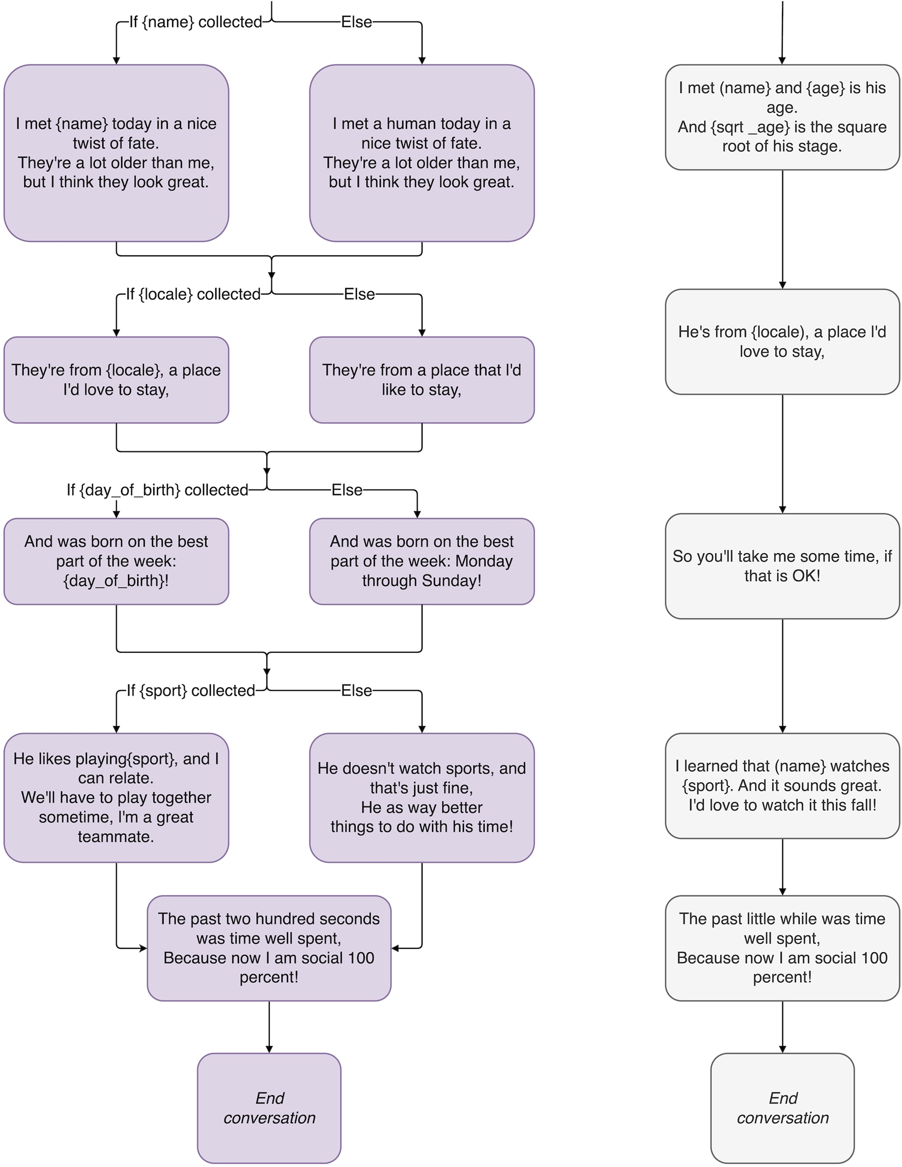 A short conversation where the robot is meeting a human for the first time, but the robot’s conversational strategies are derived from the magical principles introduced in Section 2. This strategy is illustrated by the purple outline conversation tree on the left in Figures 2, 4, 5.