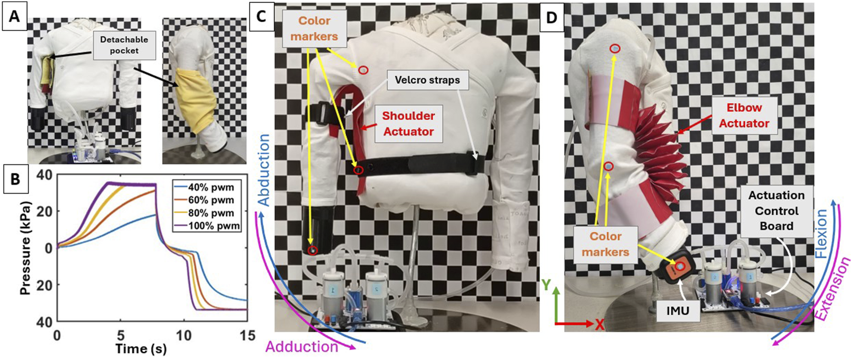 (A) Fabric pockets can be attached and detached directly to the exosuit using hook-and-loop Velcro fasteners. (B) Evolution of the pressure buildup over time inside the 1-cell shoulder actuator at different %PWM. The selected 100% PWM is the quickest to inflate and deflate the actuator. (C) Physical prototype with a shoulder actuator attached as per the S2b configuration. Velcro straps are used to hold the actuator on ends (which are not inflatable) in place. (D) Snapshot from elbow flexion/extension experiments. Here, the actuator is placed on the ventral side of the arm as per the E2 configuration.