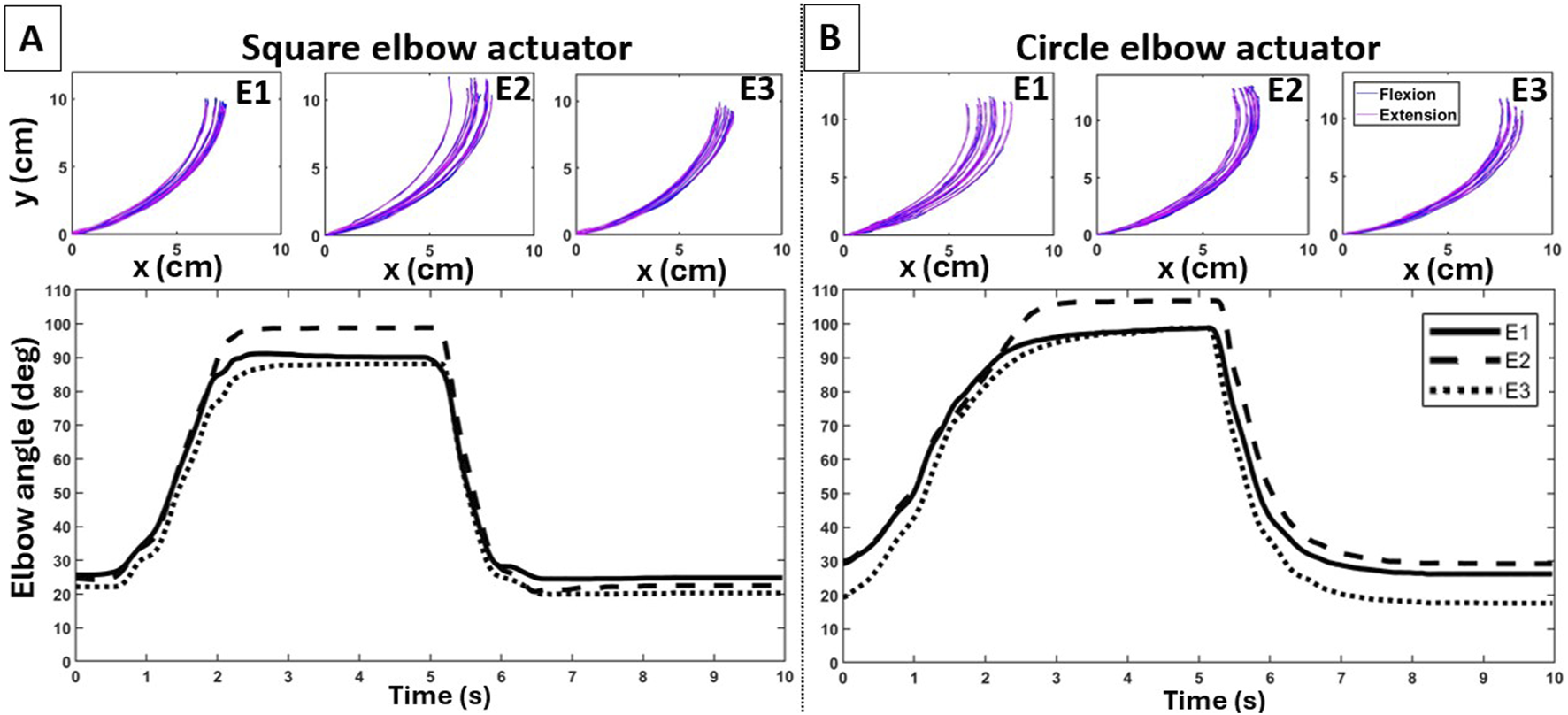 Individual trajectories of the end-effector (top panels) and average curves in elbow joint angle (bottom panels) during deflation (flexion) and inflation (extension) across the three configurations for the square (A) and circular (B) elbow actuators.