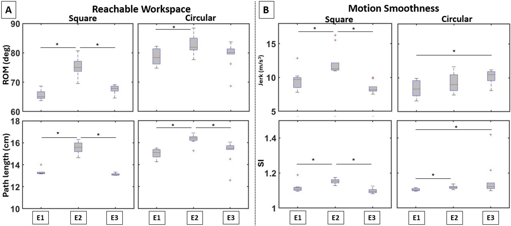 Significant differences in elbow ROM were noted across the various configurations (Figure 6A [top row]) for both the square (, ) and the circular (, ) actuators. Specifically, ROM was significantly greater when the square actuator was attached in E2 (75.223.750) as compared to E1 (65.651.670, ) and E3 (67.511.630, ) configurations. For the circular actuator, ROM was significantly greater when it was attached in E2 (82.623.110) as compared to E1 (78.642.890, ) but not E3 (79.424.320, ). Additionally, significant differences were found in end-effector path length across the different configurations for both the square (, ) and circular (, ) actuators. Post-hoc comparisons for the square actuator revealed a significantly larger path length in the E2 (15.550.54 cm) as compared to the E1 (13.320.25 cm, ) and E3 (13.130.10 cm, ) configurations. Lastly, path length was significantly larger in E2 (16.320.43 cm), compared to the E1 (15.000.44 cm, ) and E3 (15.211.01 cm, ) for the circular actuator.