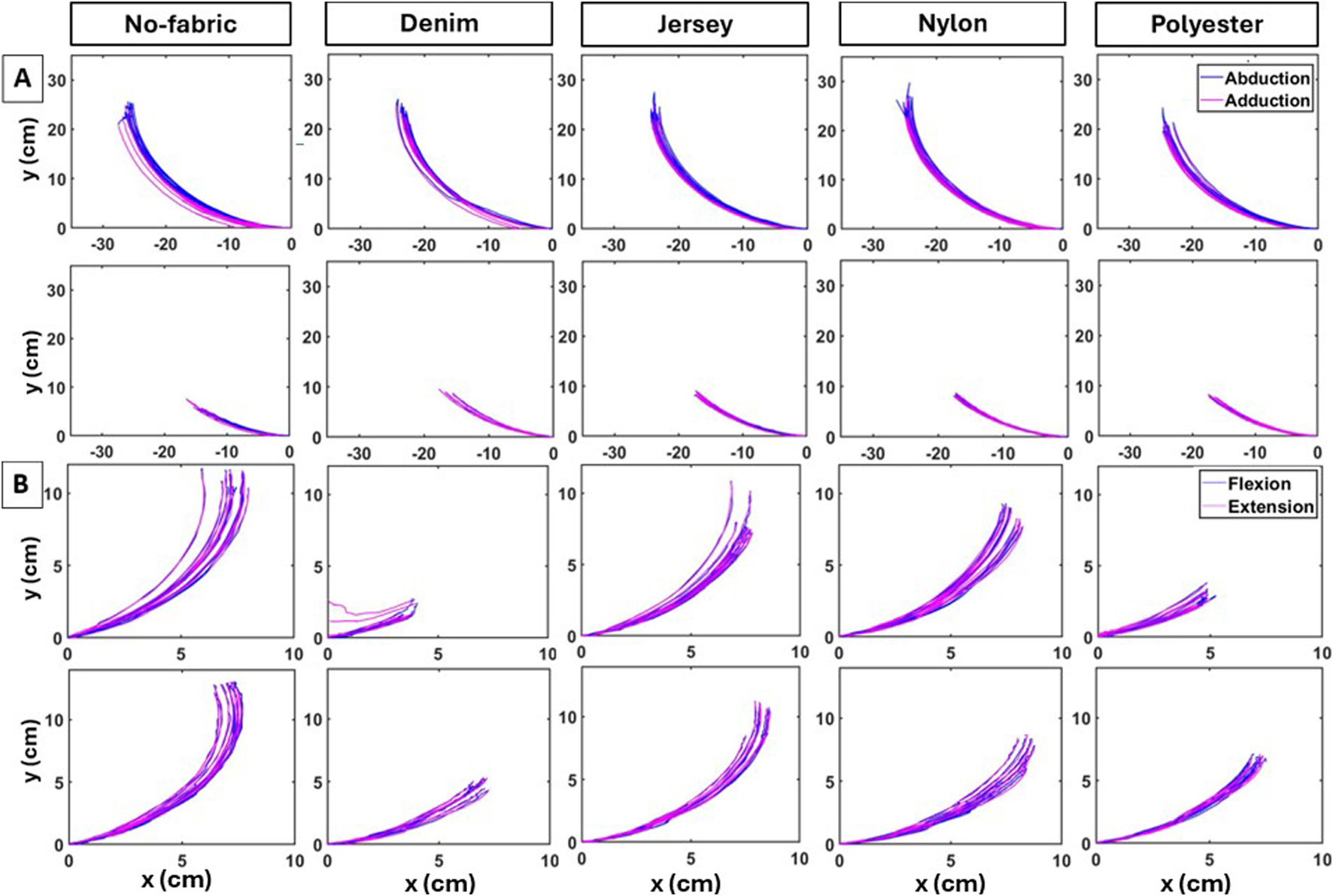 Individual end-effector trajectories of the shoulder (A) and elbow (B) actuators as the fabric of the actuator enclosures varied. Top- and bottom-row panels in (A) were obtained from 1-cell and 2-cell shoulder actuators in S1b configuration, respectively. Similarly, in (B), top- and bottom-row panels were obtained from square and circular elbow actuators in E2 configuration, respectively.