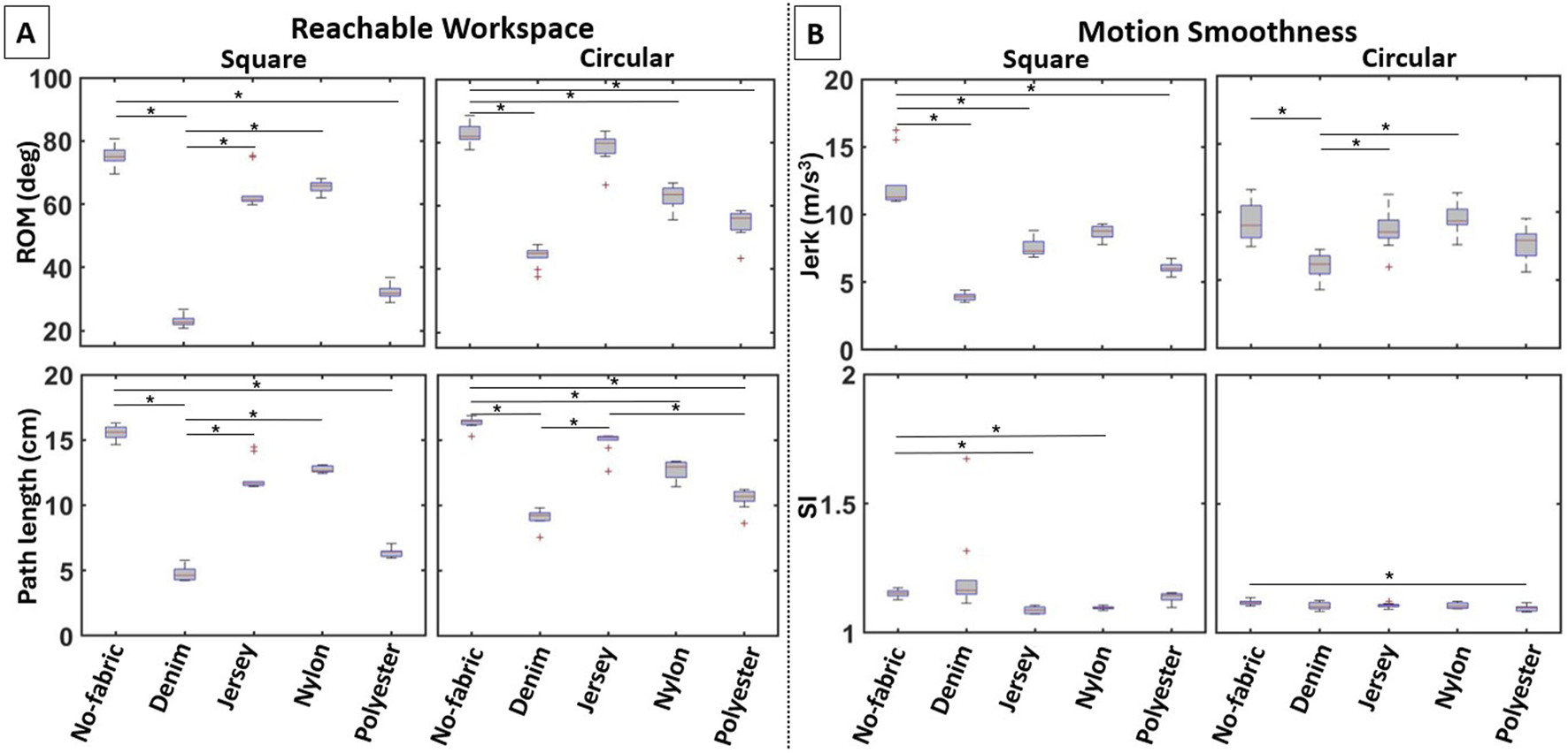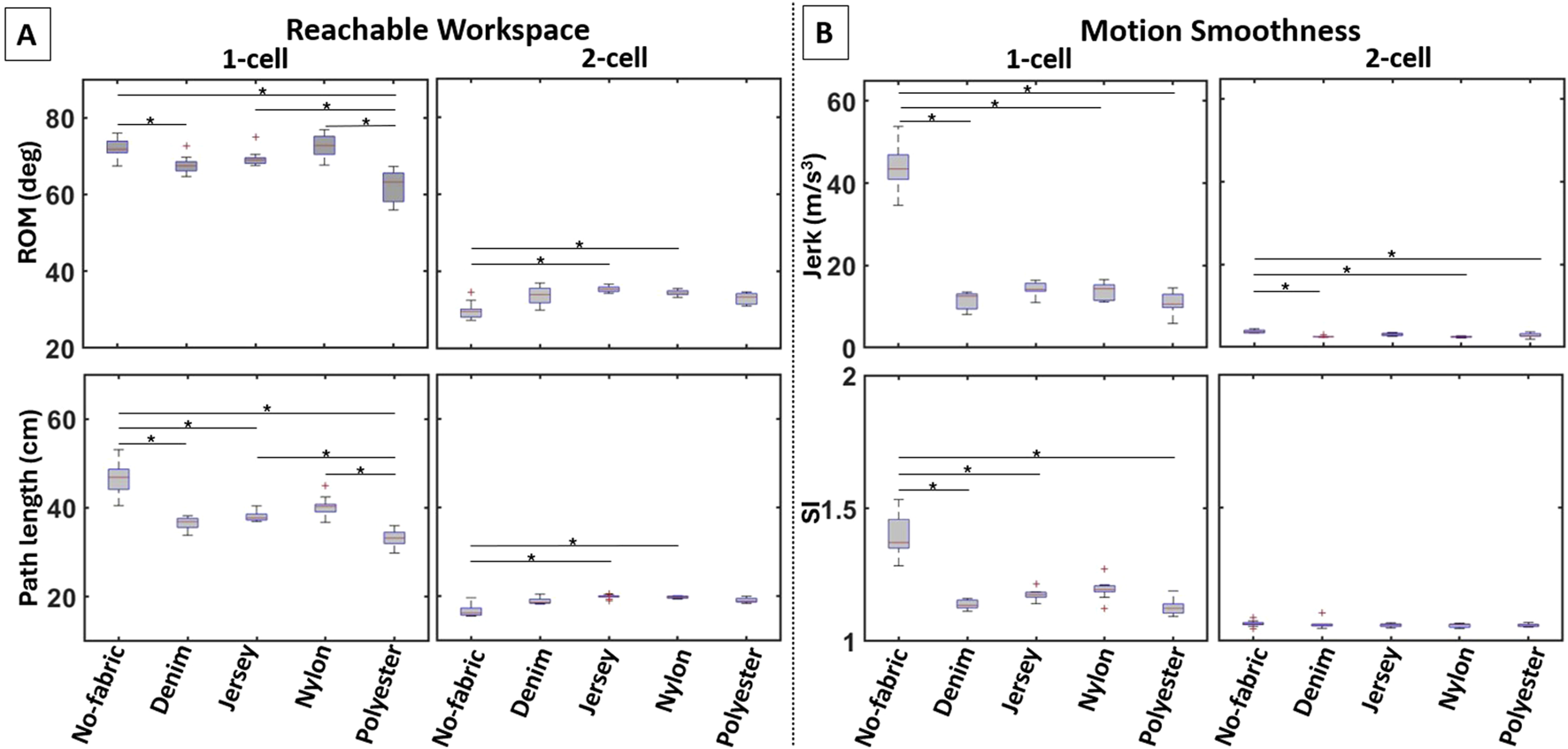 Non-parametric tests were performed to assess the potential effect of varying the anchoring points and fabric types on the reachable workspace and motion smoothness (violation of normality was confirmed with the Kolmogorov-Smirnov test). To assess changes due to varying the attachment points on the UA (S1, S2) and the waistline (PAL, MAL, AAL), Mann-Whitney U and Kruskal–Wallis H tests were conducted, respectively. Accordingly, Kruskal–Wallis H tests were performed to determine group differences across the elbow actuator attachment configurations (E1, E2, and E3). To assess changes in the reachable workspace and motion smoothness due to the different fabric types used for the detachable pockets (nylon, jersey, denim, polyester, and no-fabric), Kruskal–Wallis H tests were conducted. The significance level at 0.05 was Bonferroni-adjusted to account for multiple comparisons. The aforementioned statistical approach was followed for all shoulder and elbow actuator variants. Statistical analyses were conducted with SPSS v.27.