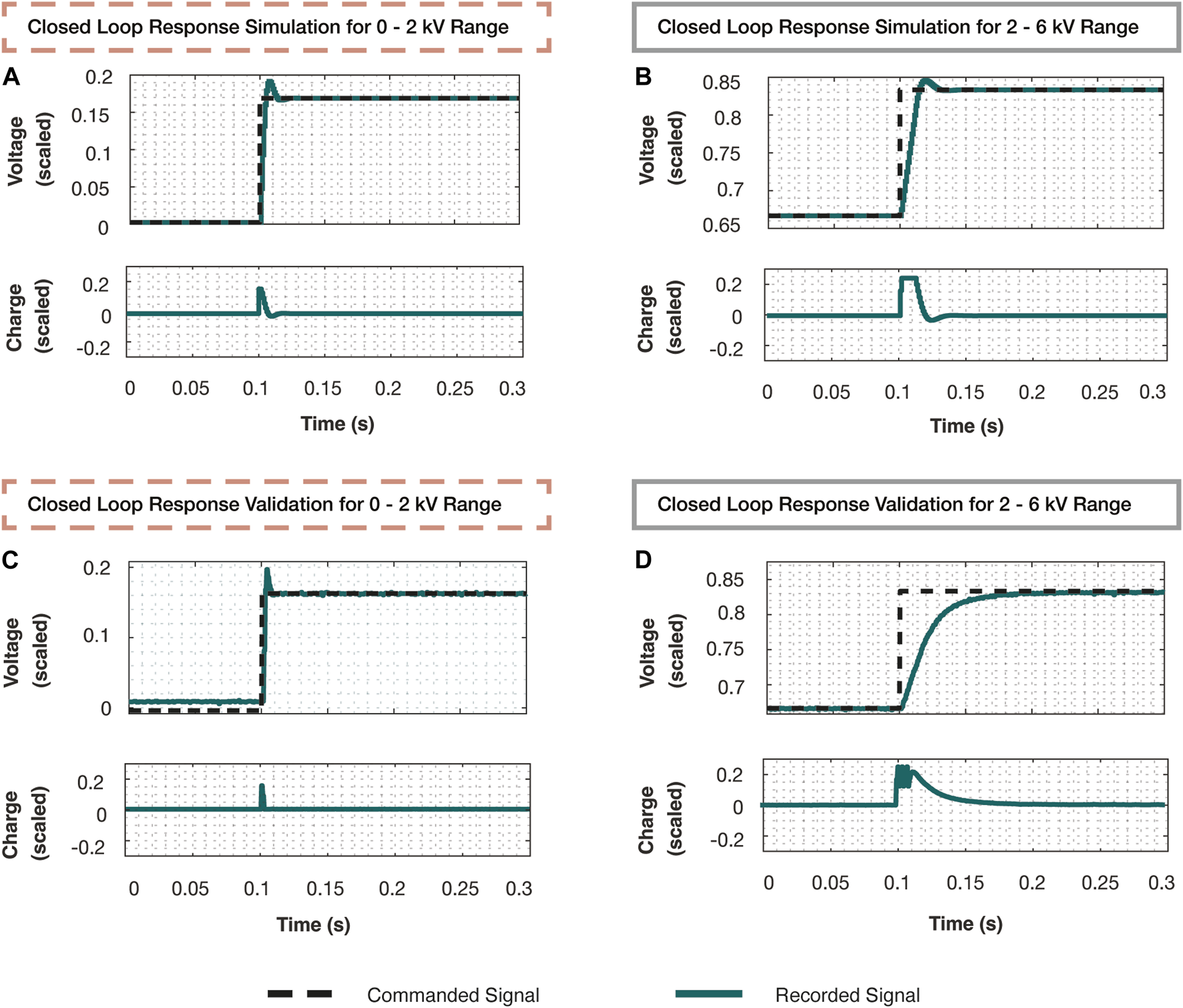 Before implementing the voltage controller on the physical system, a simulation was created in the Simulink environment, with additional measures to ensure that a discrete-time controller maintained similar performance to the continuous-time controller. The resulting closed loop simulations can be found in Figures 5A,B. The new lag compensators were discretized at 1,000 Hz using a zero-order hold and implemented into the system as