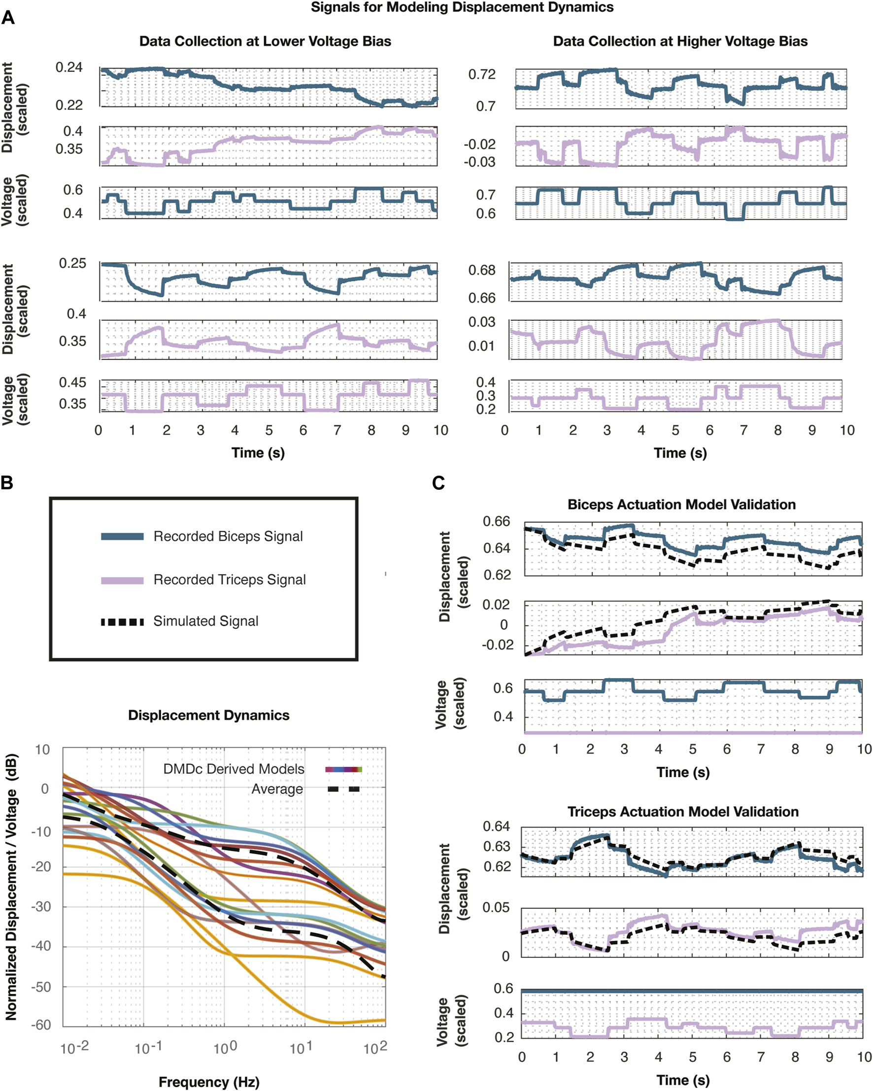 Next, we commanded both muscles with random step inputs lasting 0.2–1.2 s and ranging in magnitudes of V around the voltage biases. This system identification data was recorded at each bias for 10 s of biceps actuation and 10 s of triceps actuation, and can be observed in Figure 6A.