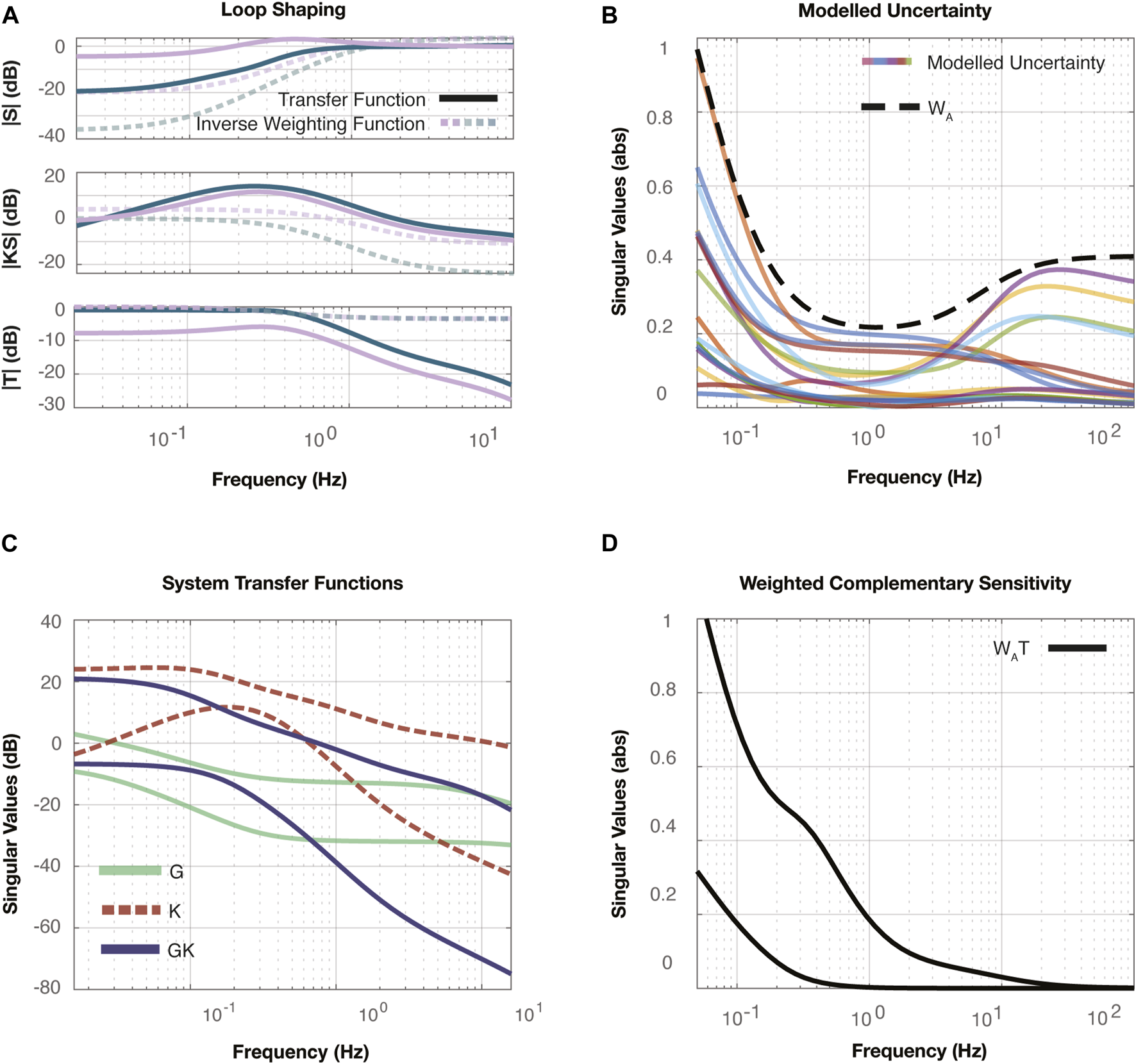 (A) The mixed synthesis results are shown with the three singular value plots. The top plot compares the resultant system’s sensitivity, , and compares it to the inverse of the weighting, to help reach performance requirements, such as steady state error and tracking. The middle plot compares the closed loop transfer function, , to the inverse of the weighting, , to help minimize the control efforts from the system. And the last plot compares the complementary sensitivity, , to the inverse of , to ensure the system does well in the presence of output disturbances, or noise. (B) The additive uncertainty, , is modelled in this singular value plot. The transfer function, is developed and superimposed to create the upper bound on the additive uncertainty, , as . (C) The transfer functions plotted correspond to the plant, , controller, and open loop, to demonstrate the resultant “shape” of the system following controller synthesis. (D) The resultant weighted complementary sensitivity, , is plotted. For our system to remain stable for all possible plants determined, it is critical that the magnitude of this transfer function remains under the value 1, which can be observed above Hz.