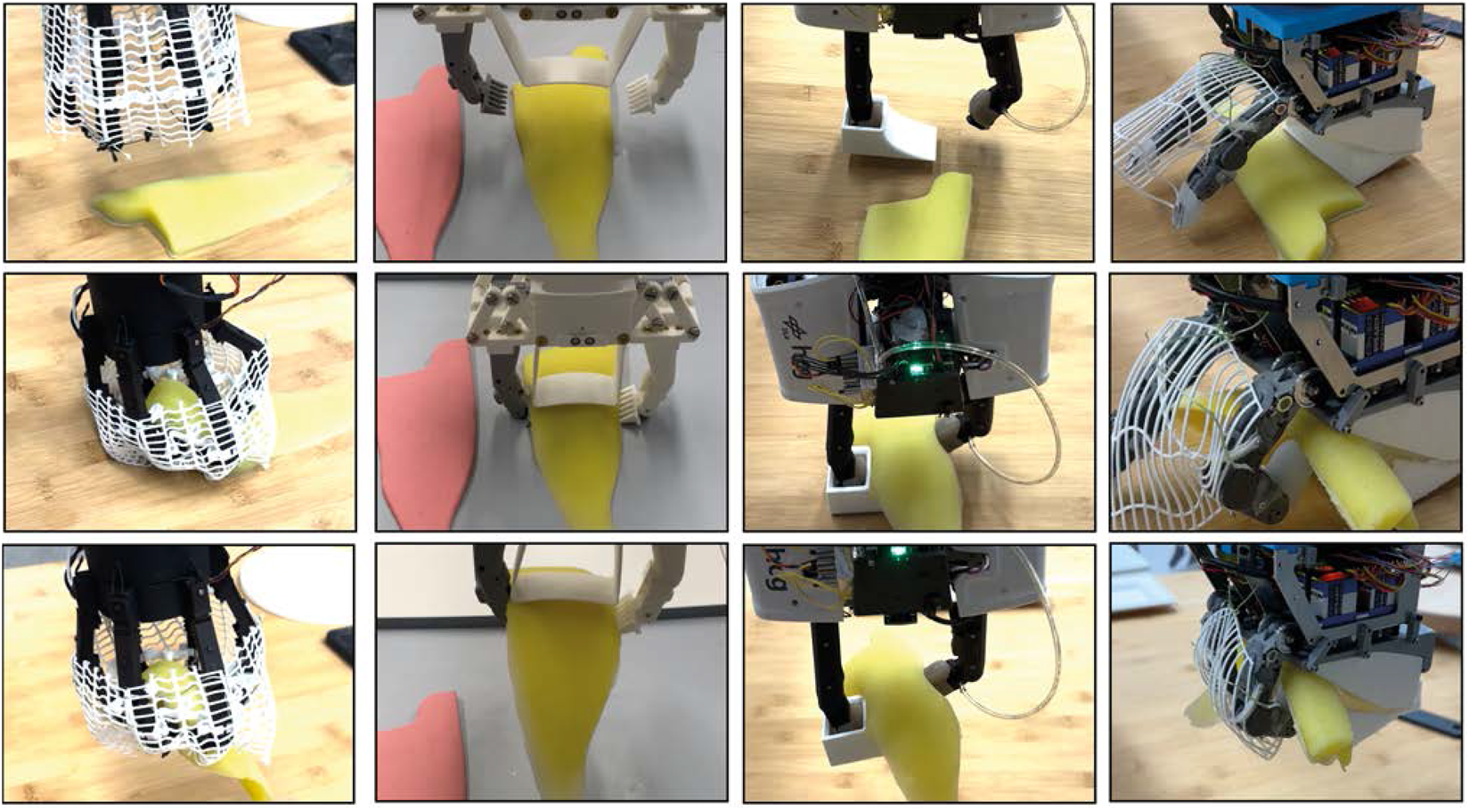 Figure 8. Grasping single items. From left to right: Constriction gripper, SoftEnable linear scoop gripper, HCG with suction fingertips, Two finger Palm Hand; Last row shows the space around each gripper to place it in clutter areas.