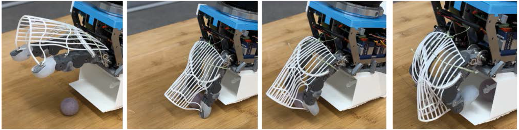 The first version of the Constriction Gripper (CG) was designed to be simple, energy efficient, and used for caging spherical objects and net bags (Figure 3, left). Most grippers or hands generate the needed torque to grasp objects in the base of the phalanges, and the required torque on the base motor increases with the length of the fingers. The constriction gripper generates the force in the fingertips with a circular chord that ties the fingertips together, and the tips of the chord are commanded from the base of the gripper. This prototype uses spring steel bars as fingers and a Ditex servo to move the tendon that closes or opens the hand. The tendon was guided in the top of the bars by printed parts with PTFE tube inserts to reduce friction. Initial tests showed a good weight to lift ratio of 40 g tare weight to over 6,000 g of load. For higher loads the bonding of the bars failed.