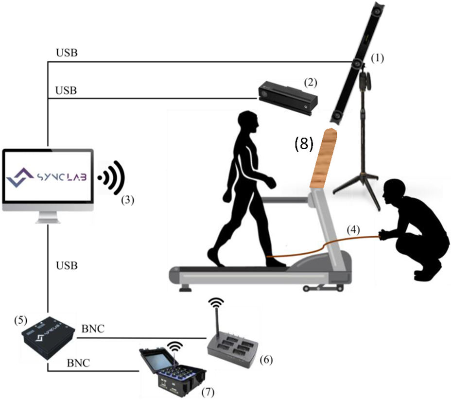 During the trials, subjects wore a safety harness system to prevent falls in the event of an irreversible LoB. This system involved a vest connected to a ceiling structure using a rope. The length of the rope was adjusted to maintain a minimum distance of 15 cm between the knees and the treadmill belt when the subject was suspended (Okubo et al., 2019). This adjustment was made by instructing subjects to lift their feet, thereby applying their full body weight to the harness system. To achieve synchronized data acquisition from all the sensors, the Sync Lab Desktop Application for Windows OS developed by our team, was employed. Trigger signals were sent by electronic pulses or via wireless.