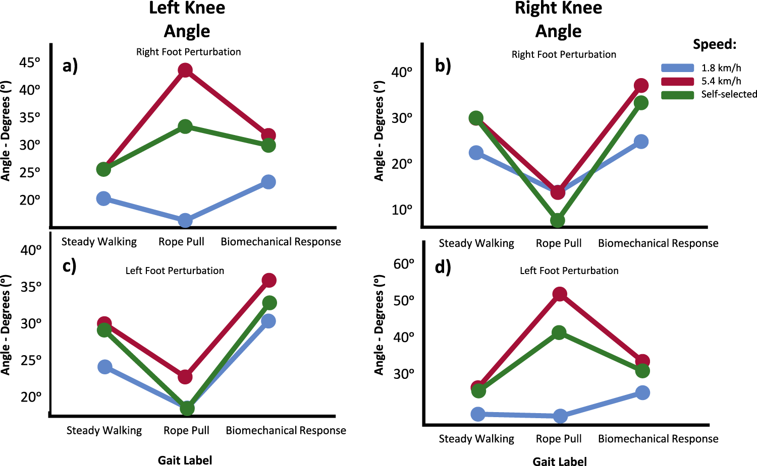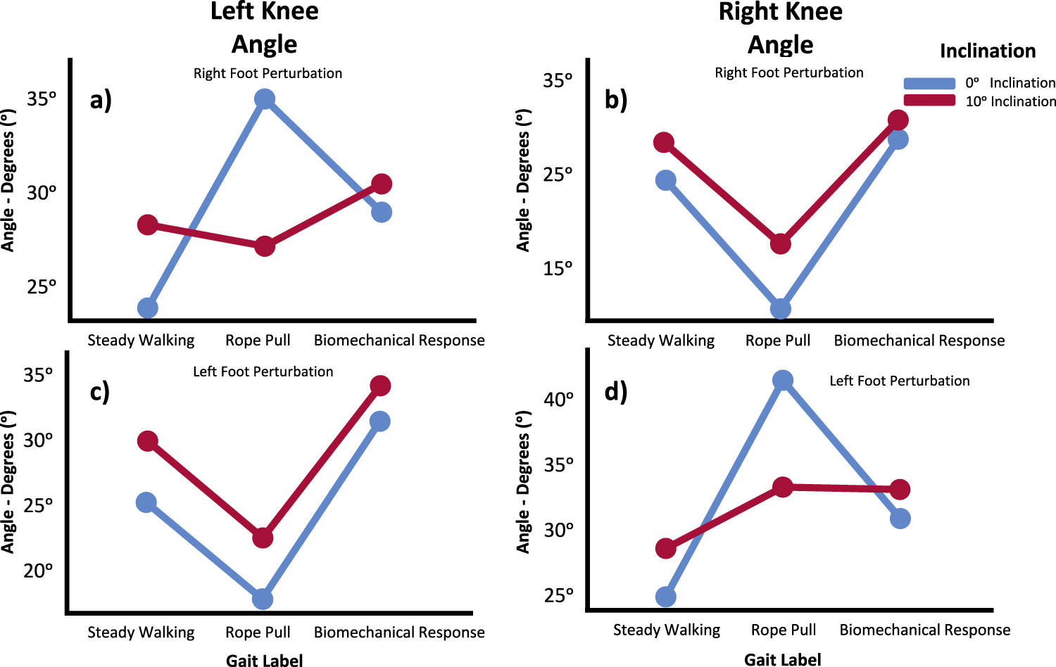 Knee angle means in the Sagittal Plane for Left (A, C) and Right (B, D) during Steady Walking, Rope Pull, and Biomechanical Response. Analysis considers interaction effects of perturbation, foot perturbed, and inclination. Increasing angles indicate flexion, while decreasing angles indicate extension movements.