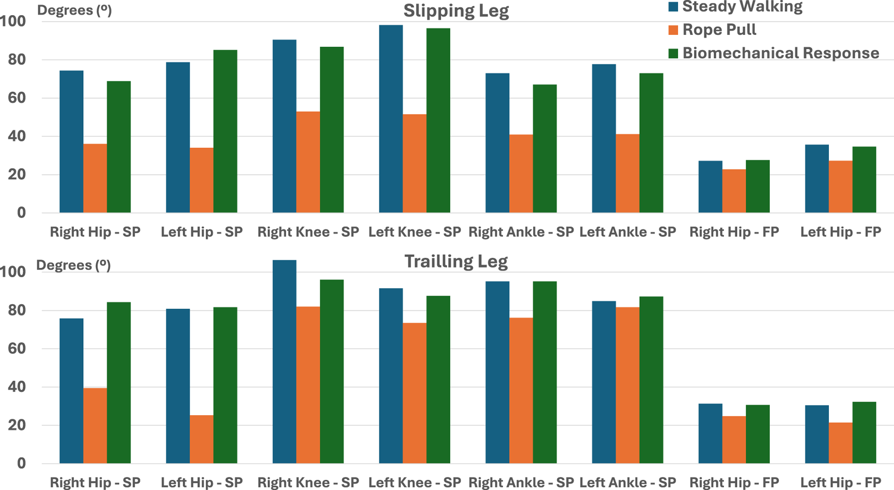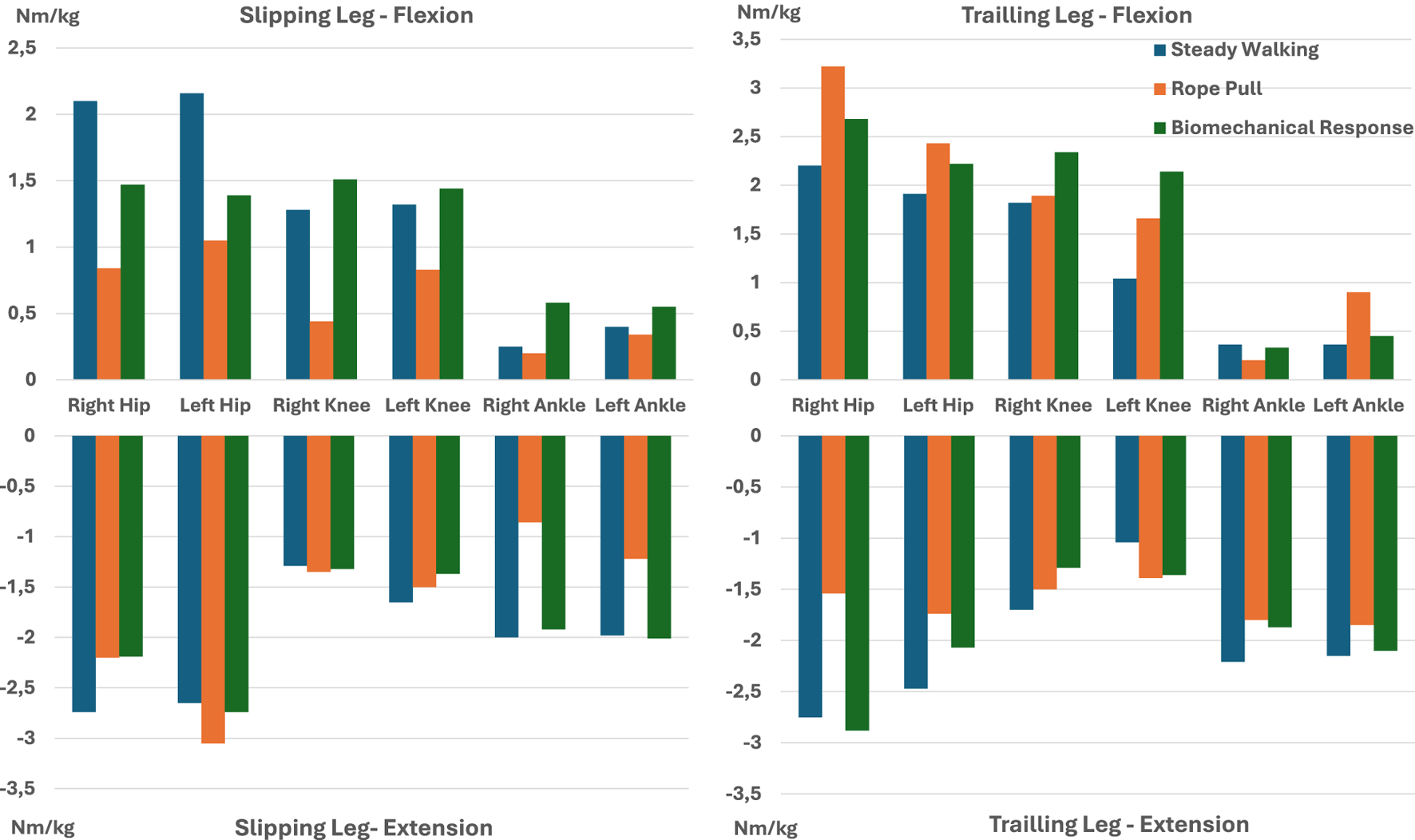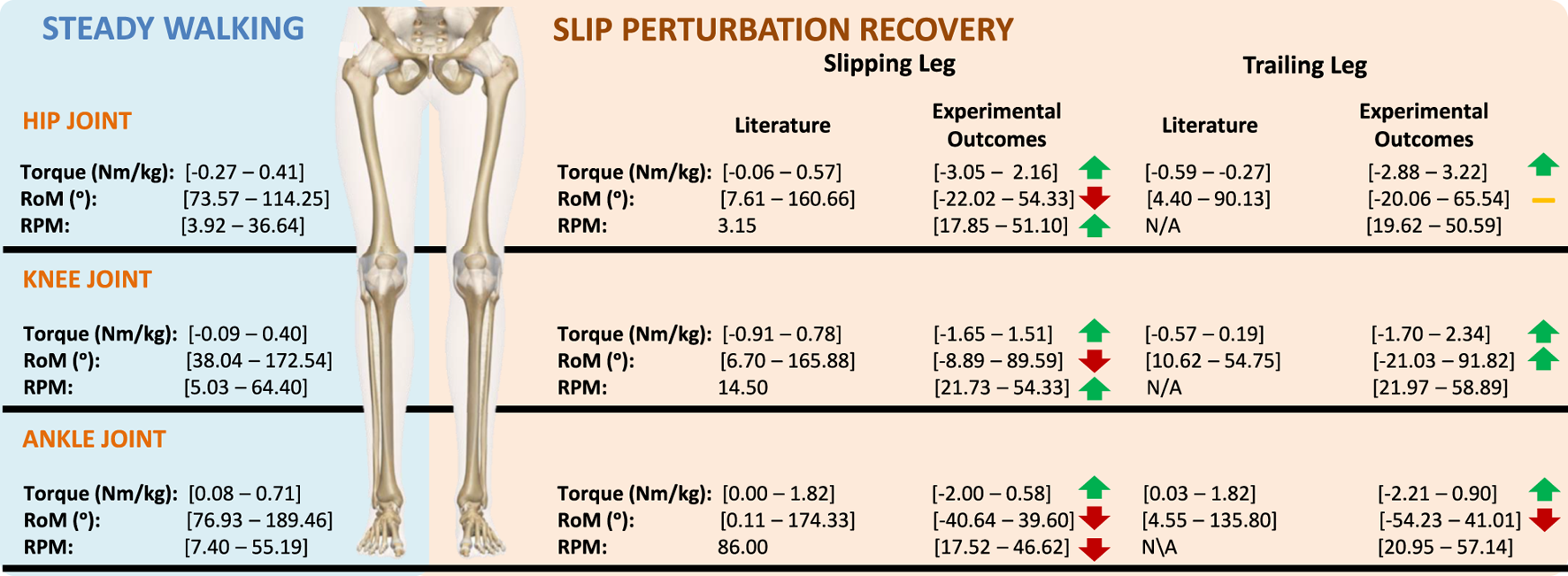 The biomechanical response to slip-like perturbations by the hips, knees, and ankles of the slipping leg was characterized by extension, flexion, and plantarflexion moments, respectively. In the trailing leg, responses included hip flexion, knee extension, and ankle plantarflexion. Additionally, these responses were influenced by gait speed, surface inclination, and perturbation intensity. Our study identified target range of motion parameters of 85.19°, 106.34°, and 95.23° for the hips, knees, and ankles, respectively. Furthermore, rotations per minute values ranged from 17.85 to 51.10 for the hip, 21.73 to 63.80 for the knee, and 17.52 to 57.14 for the ankle joints. Finally, flexion/extension torque values were estimated as −3.05 to 3.22 Nm/kg for the hip, −1.70 to 2.34 Nm/kg for the knee, and −2.21 to 0.90 Nm/kg for the ankle joints.