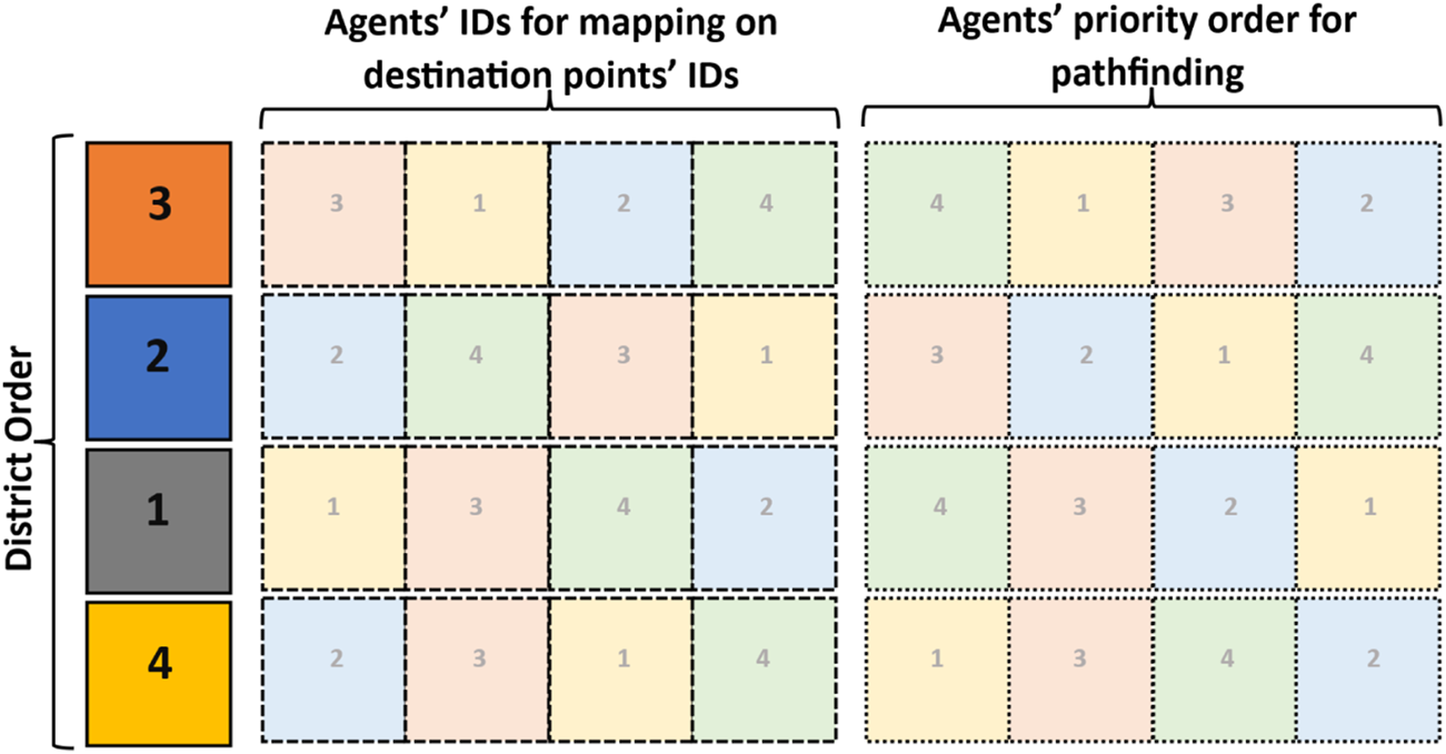 According to the features defined for the final solution, the suggested chromosome structure is composed of the district identifiers, the agents’ identifiers allocated to the destination points, and the order of agents’ identifiers for collision-free pathfinding. Therefore, each chromosome can be described as a matrix that is structured as shown in Figure 2.
