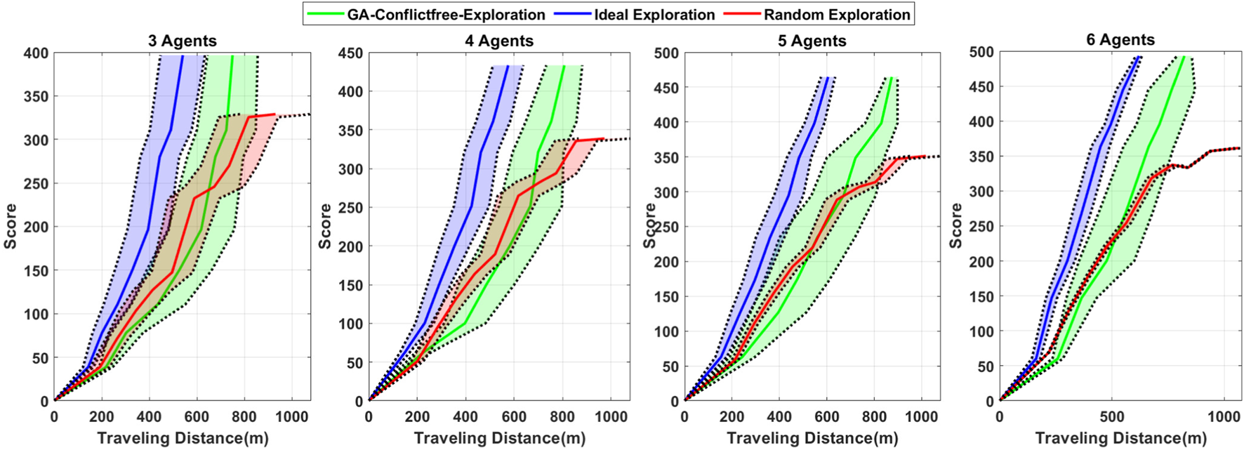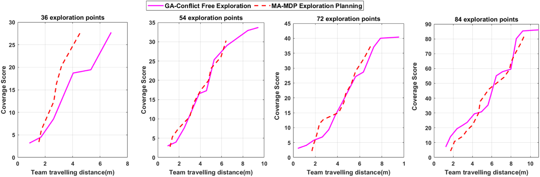 In order to compare the proposed algorithm’s performance with that of other planning schemes, two other methods are considered. It is assumed that there is no possibility of collision with the obstacles, and the agents can fly between different formations directly in both comparison algorithms. In the first scenario, an ideal exploration is considered, which includes the shortest path between all the destination points. In the second case, the random search is considered for the group, which is a classic method for exploration. The coverage score is defined to consider the number of exploration points in each district proportionally and the points scattering diversely. It means that the districts with more exploration points which are less sparse have the highest score. It is evident that if the agents cover all the districts, they will achieve the highest score.