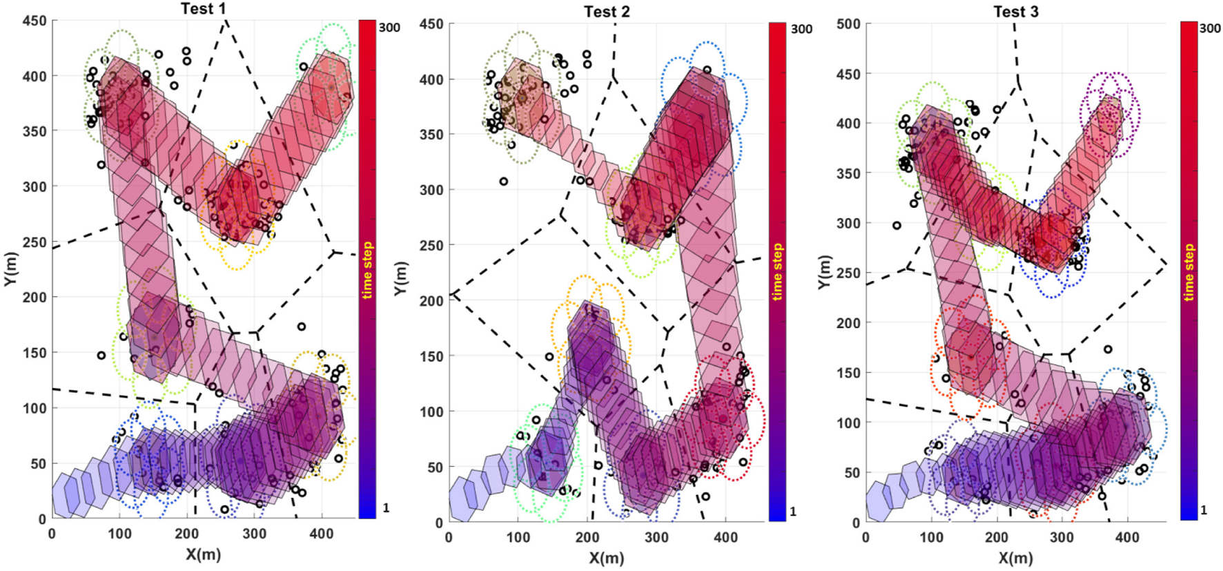 Figure 3 demonstrates one of the sample missions for performance evaluation. It depicts how the exploration subdomains are formed and how the formation shape will look according to the exploration points’ distribution in each subdomain.