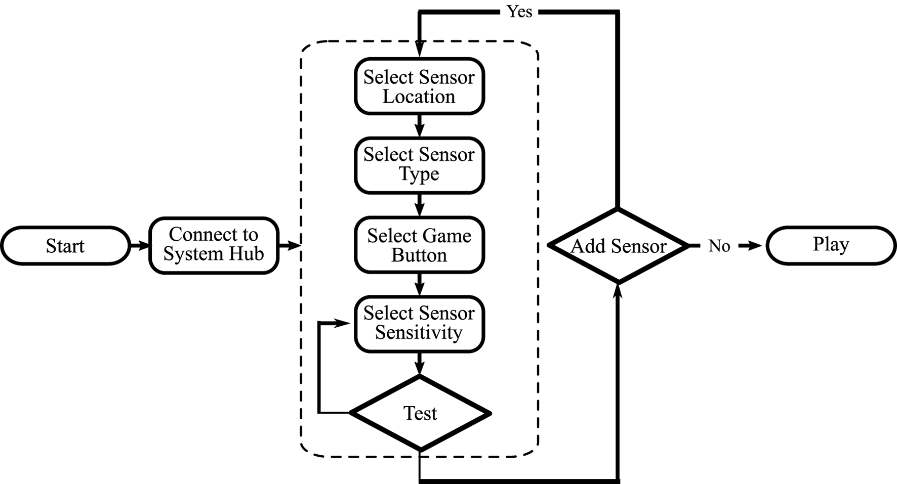 A program to facilitate the mapping of sensor data to in-game buttons was created using C# and Visual Studio 2022. The program was designed to be a simple user interface (UI) that would allow a medical specialist or patient to use it without extensive technical training. The software handles complex tasks and allows the user to be able to focus on the relevant features. When the program is first loaded, a welcome screen is displayed with a summary of the three steps needed to be able to use the system. The first step is a tab that connects the computer to the MWB System Hub. In code, this checks for the correct COM port and establishes a serial connection with the microcontroller. The second step takes the user to the sensor pairing screen. This screen allows for a sensor to be mapped by specifying the location of the sensor on the body, the type of sensor being used, the sensitivity of the sensor, and the in-game button to be mapped to, Figure 3. Once all specifications have been set, the user can test the sensitivity threshold by using the sensor. When the threshold has been reached, the on-screen button icon will turn green. This indicates the point in the game at which that button will be activated. The third step indicates to the user that they may close the program and focus their attention on the monitor to which the game system is connected. The user can then play the game with the control method they previously established. The software usage flow chart is shown in Figure 4.