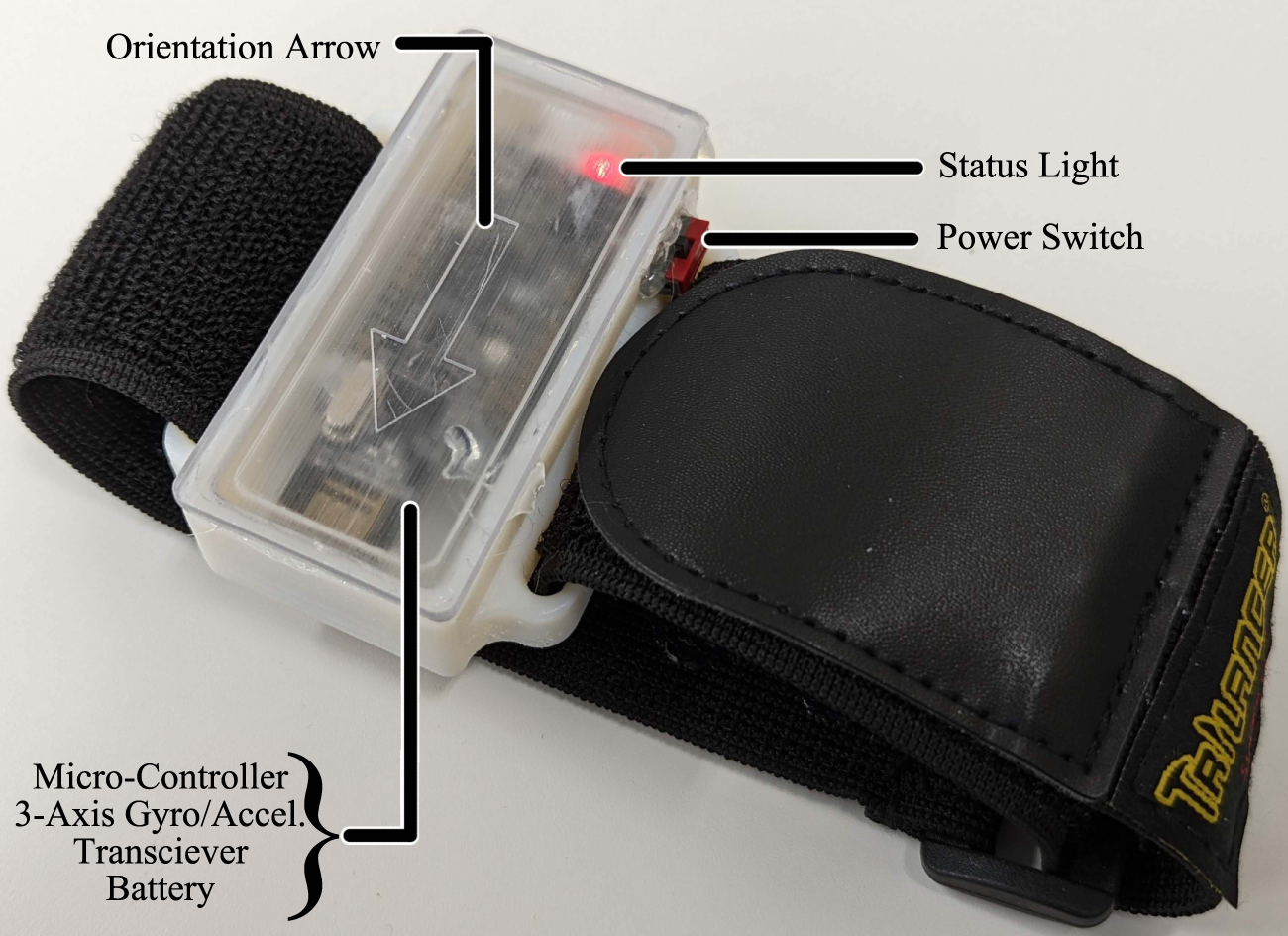 The motion sensor, shown in Figure 5, consists of a micro-controller (Adafruit Feather M0 Express - ATSAMD21 Cortex M0, Adafruit, US), 3-axis gyro accelerometer sensor (GY-521, AiPCBA Technology Co., Ltd., China), and wireless transceiver (nRF24L01, Nordic Semiconductor, Norway). These components are housed inside a 3D-printed case and can be worn by the user via a hook-and-loop strap. The sensor is powered by a 3.7v 820 mAh rechargeable Li-Ion battery. The microcontroller was programmed using the Arduino IDE. When the device is powered on, the microcontroller will continuously send data from the 3-axis sensor to the system hub. If the values exceed the threshold specified in the MWB computer software, it will trigger the desired in-game button.