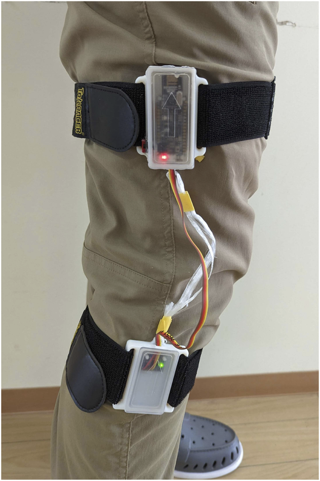 Joint angle sensor worn to measure the user’s knee angle.