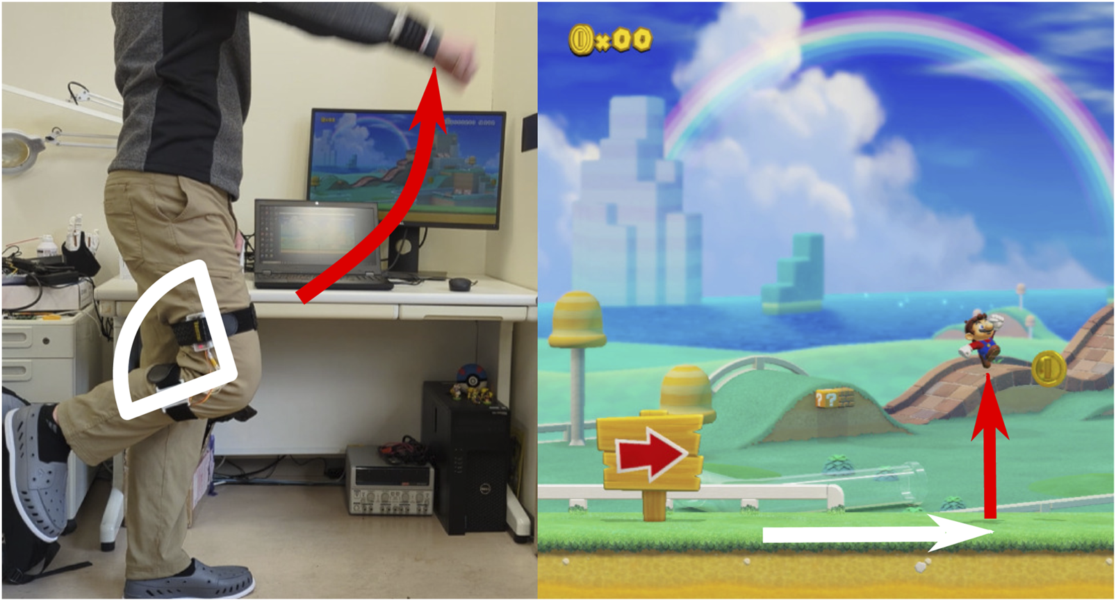 Figure 7 shows one example of using the motion sensor and angle sensor to play a simple Mario level. When the motion sensor on the arm is raised passed a specified threshold, Mario will jump (shown in red). When the joint angle sensor on the knee exceeds the threshold, Mario will move forward (shown in white).