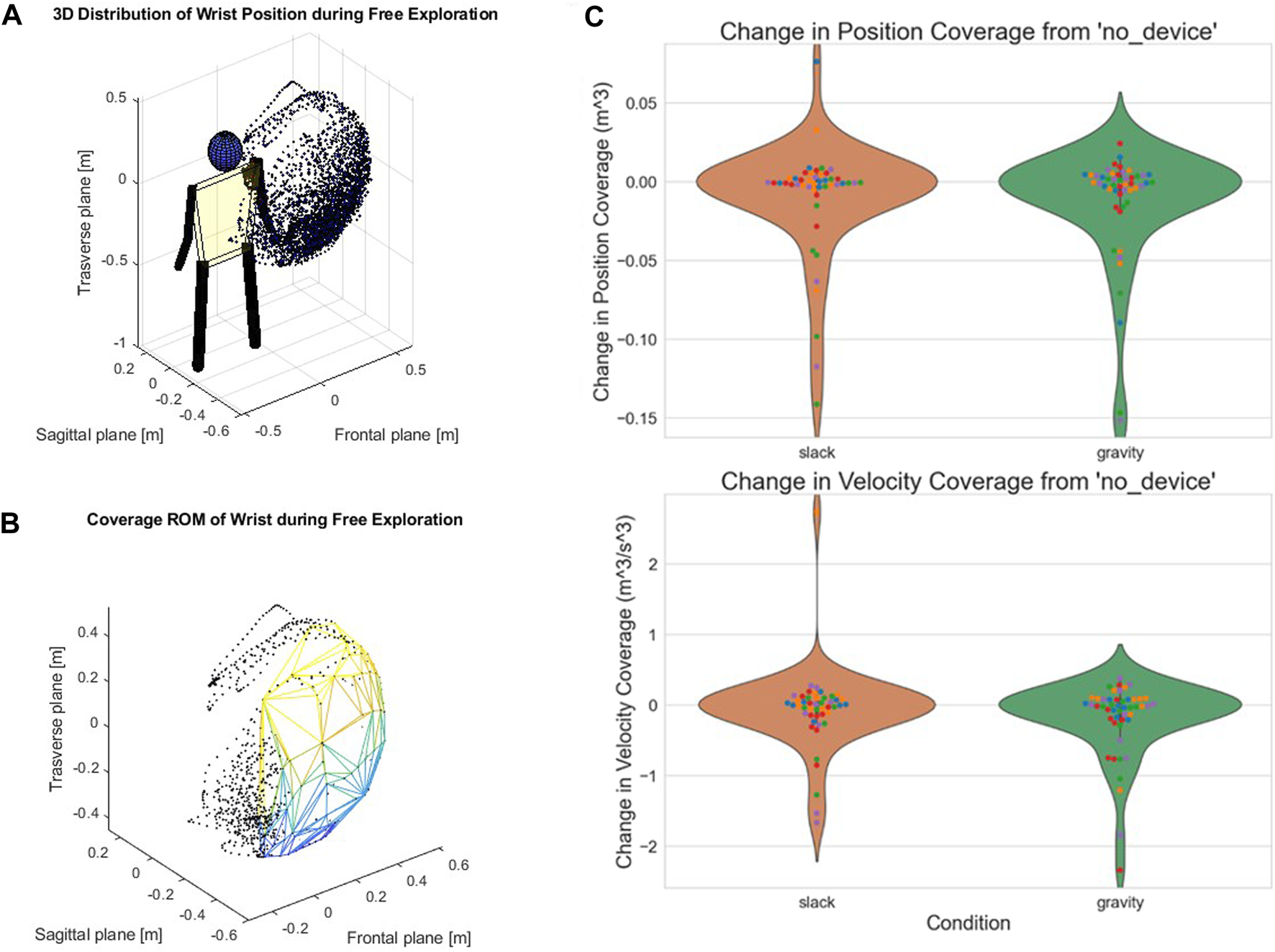 Figure 5. Direct Kinematic Effects in Position and Velocity Coverage. (A). Example 3D point cloud distribution of wrist positions from a single movement phase (Free Exploration) of a single subject. (B). Polygon formed from the convex hull algorithm. This example illustrates nearly full range of motion despite wearing the device. (C). There were no kinematic changes from donning the device (orange) and from the gravity compensation condition (green), using our coverage metric. Mean change in coverage was close to 0 for the slack and gravity conditions compared to the no device condition, with mixed effects analysis revealing no significant changes between groups.
