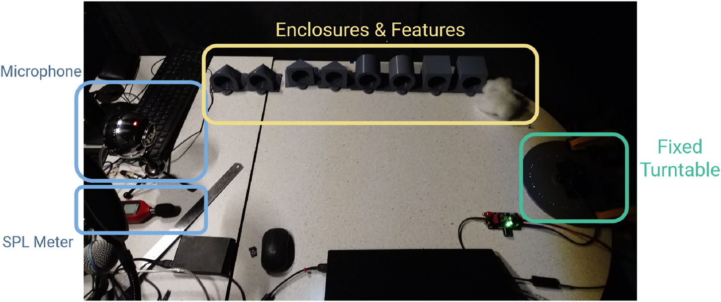We performed this experiment in a semi-anechoic (i.e., noise-absorbent other than the floor and ceiling) room. For each enclosure design, we recorded the output from the same speaker driver (i.e., a MISCO Oaktron 93,003 powered by a DROK 5 W amplifier breakout board) playing 20 kHz–20 Hz sweeps generated by the program Audacity. We rotated the speakers incrementally between and by to test for directivity. A Blue Snowball USB microphone, set up on the same table 1 m away from the speaker, recorded the resulting sound. Figure 5 shows the test setup.