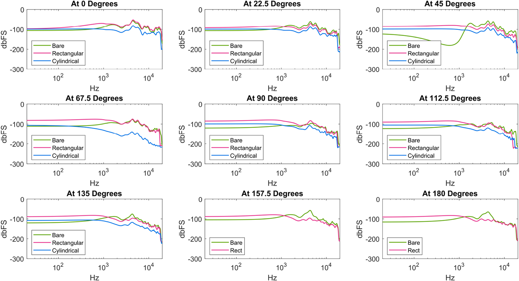 Figures 6, 7 show the results of the speaker shape and feature testing, respectively. At a high level, the clearest observed differences between enclosure options were due to shape. The rectangular shape performed the best out of the different shapes considered, as evidenced by the generally higher values it sustained at lower frequencies. While there were frequencies for which the bare condition outputted a higher volume, the rectangular condition had a much more consistent and relatively flatter profile throughout the tests (i.e., more similar in overall shape to the Harman target by comparison). The bare and cylindrical speakers notably exhibited spikes and troughs during disalignment, as seen at and degrees, respectively. For other speaker features (e.g., fillings, grilles), there were few distinctions between the considered enclosures. The most notable difference was for the filleted enclosure, for which the loudness of the non-rotated speaker was negligible until around 1 kHz.