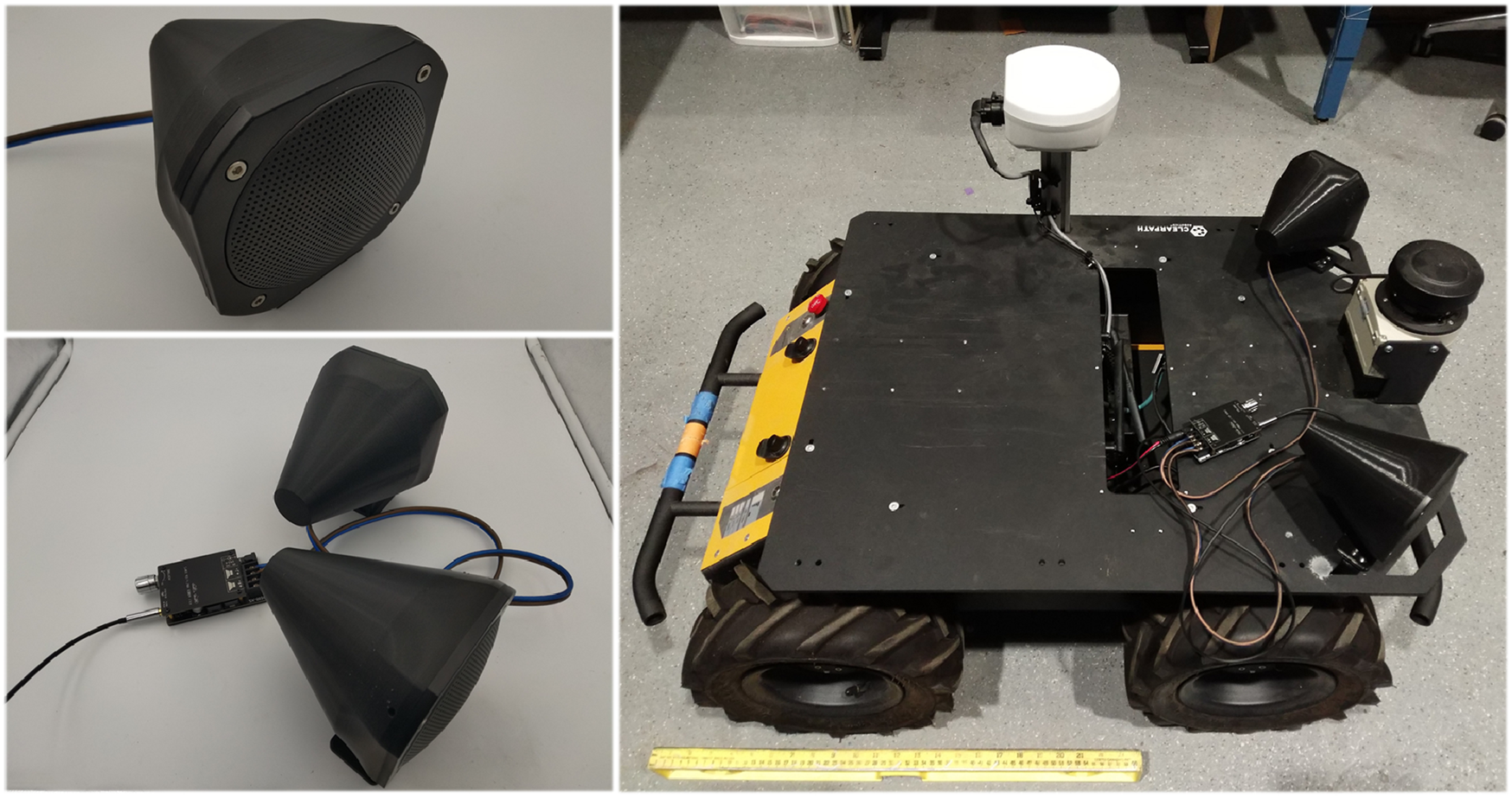 Speaker Enclosure: The speaker enclosure was designed based on recommendations outlined in Section 3.2. We sought to maximize internal volume without an excessive footprint, selecting a footprint of 125 mm long and 115 mm wide instead of the exceedingly large manufacturer-recommended enclosure volume of 2 L (Visaton, 2015). The enclosure was 3D-printed using polylactic acid (PLA). In order to improve the acoustics of the speaker, the enclosure was filled with a polyester filament based on recommended practices from past work (Dickason, 2006). The enclosure coupled with a custom mounting plate (as shown in the left side of Figure 2) that clamped to the top mounting plate of the Husky. This design can easily be adapted to mount to other robots.
