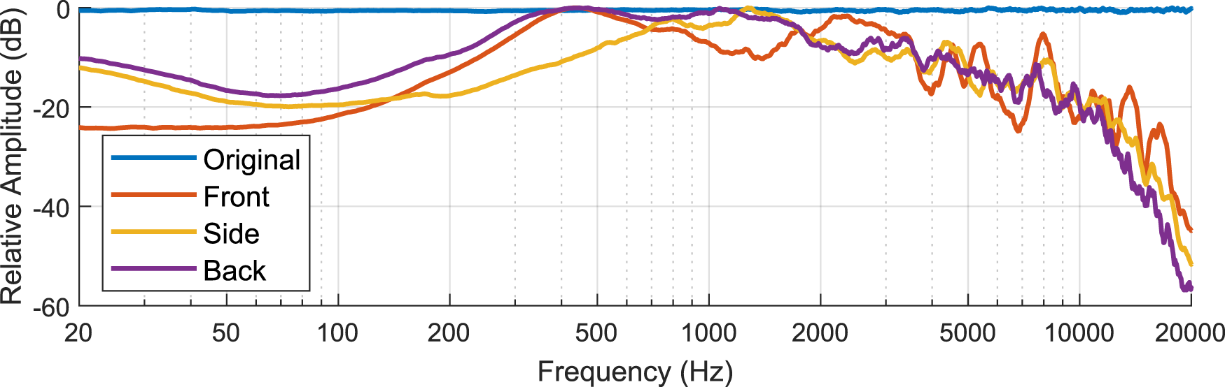 The recorded frequency responses compared with the originally played broadband noise. The data was analyzed with the Plot Spectrum tool in Audacity with size 65,536 and smoothed with a moving average filter with window size 100.