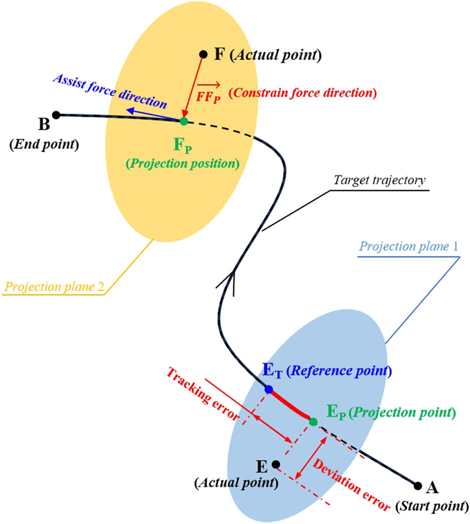 Diagram of a 3-DOF potential constraints and application of the robot-assisted force on a three-dimensional (3D) target trajectory. A and B are the starting and end points of the target tracking trajectory. E and F are the two different actual points of the end-effector of UERR at different tracking positions, and EP and FP are the respective projection points on the target trajectory, respectively. ET is the reference point of the point E on the target trajectory. EEP and ETEP are the deviation error and tracking error of the tracking movements, separately.