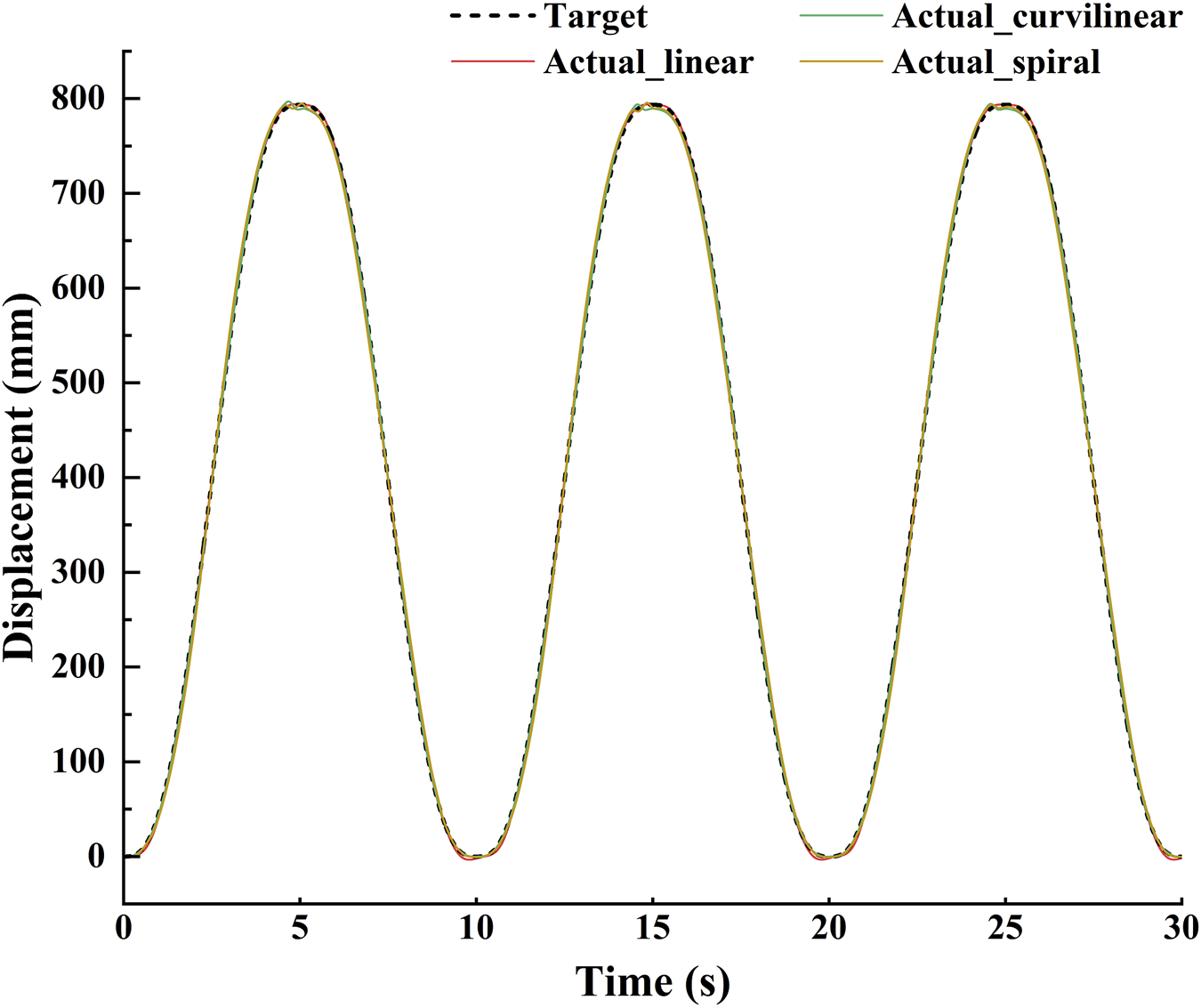 This simulation experiment was performed to simulate the tracking ability of the proposed impedance controller. A reciprocating tracking task on three types (linear, curvilinear, and spiral) of target trajectories was carried on three times to verify the performance of the impedance controller. The impedance controller was defined by Equation 1, where its stiffness and damping were Ks = 260 N/m and Bd = 10 Ns/m. Variation of minimum jerk trajectory was adopted to quantify the tracking ability of the impedance controllerwhere, Xd is a minimum jerk trajectory of the three types of target trajectories. T represents the one-way cycle time of 5 s, a cycle time of a reciprocating movement is 10 s.d represents the actual tracking displacement of a target trajectory, which is uniformly set as 796 mm in current stimulation experiment.