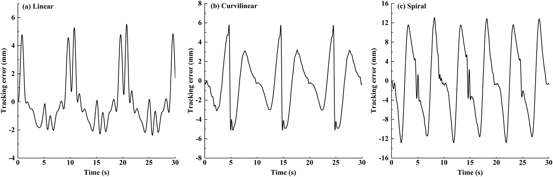 The tracking effects of the impedance controller are shown in Figures 5, 6. The Figure 5 displayed that for three kinds of target trajectories, the controller maintained good dynamic tracking performances. In addition, the Figure 6 illustrated that the maximal tracking errors occurred mostly in the conversion time of the reciprocating movements, which were 5.9, 6.1 and 13.8 mm on linear, curvilinear and spiral trajectories, respectively. On the whole, the tracking error on spiral trajectory was significantly greater than those of the liner and curvilinear trajectories (p < 0.001).