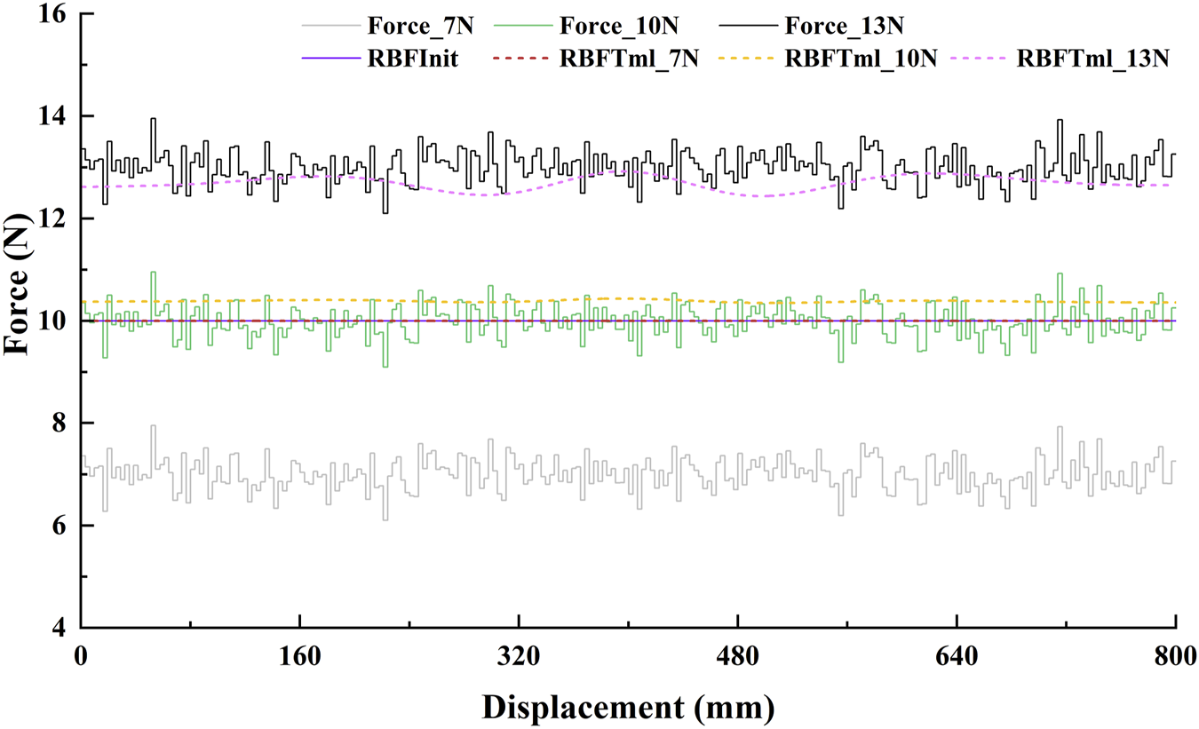 The greedy AAN effects of the GAAN controller are shown in Figure 7. Based on the initial output force of 10N, it can be clearly shown that across the whole tracking displacement, the output values of the RBF network were 0 for applied force 7N, 10.3N for applied force 10N and fluctuations around 13N for applied force 13N, respectively. The overall output values of the RBF network indicate that the proposed GAAN controller was able to learn the applied forces, and only provide the appropriate force (difference between the applied force and the initial output force of the RBF network) when the applied force higher than the initial output force of the RBF.