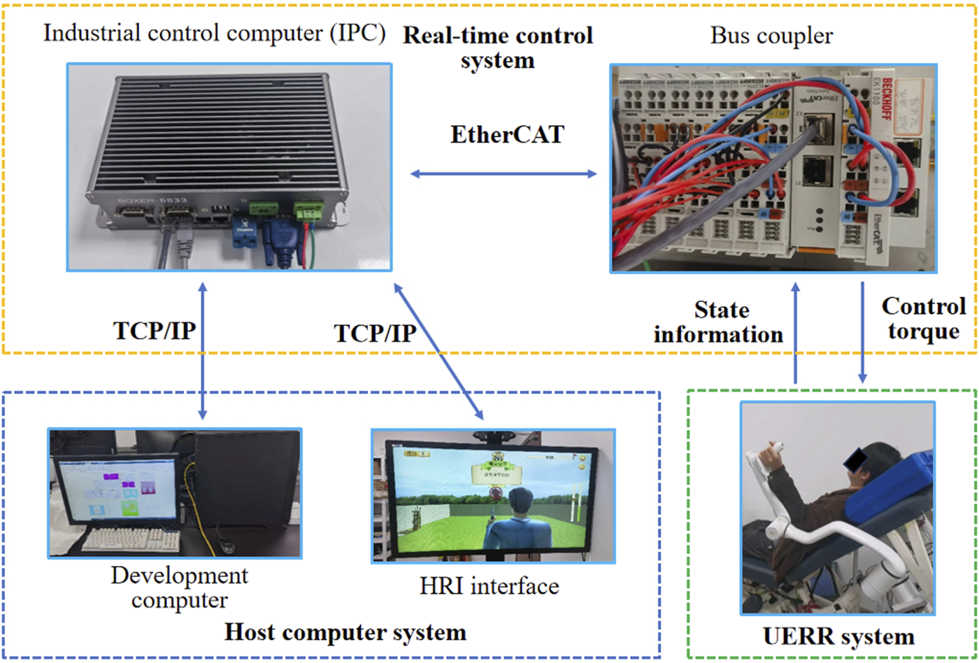 The UERR-based experimental platform, consisted of a host computer system, real-time control system and UERR-based robotic arm, was adopted in current study. The host computer system was employed to run the Simulink programs and show an HRI interface used for guide the human-robot interactive tasks. The real-time control system was used to communicate between the host computer system and the UERR. Both the state information of the robotic arm and the master commends from the host computer could bi-directionally transmitted using industrial control computer (IPC) with a Bus coupler via TCP/IP and EtherCAT communication. The UERR-based robotic arm was adopted to execute kinds of robot-assisted interactive tasks with the sampling rate of 1000 Hz, as shown in Figure 8.