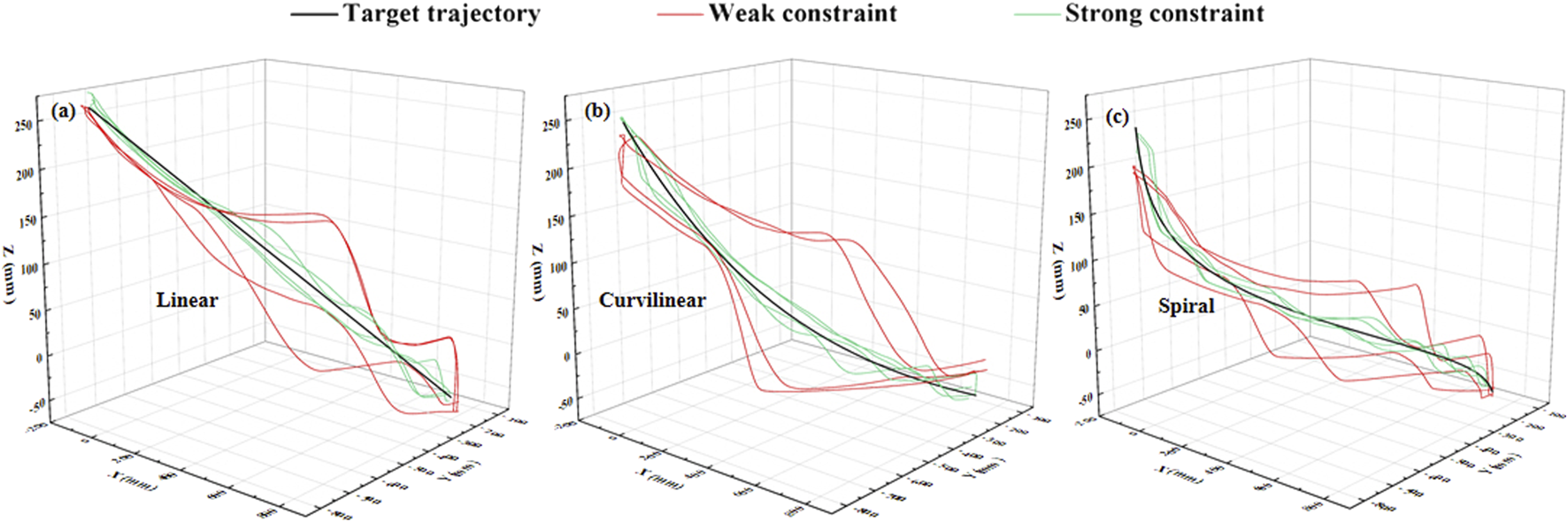 Stimulation demonstration of two levels of 3-DOF potential constraints (twice of forward and backward movements) on three kinds of typical [(A) linear, (B) curvilinear and (C) spiral] target trajectories (black color). Red and green curves indicate the weak and strong constraints, respectively.