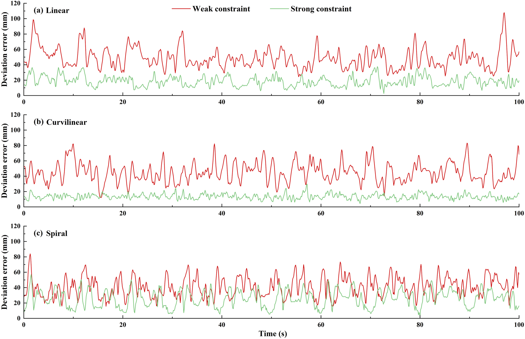 The dynamic deviation errors of two levels (weak/strong) of potential constraints on three types [(A) linear, (B) curvilinear and (C) spiral] of target trajectories over five times of stimulation reciprocating (forward and backward) movements.