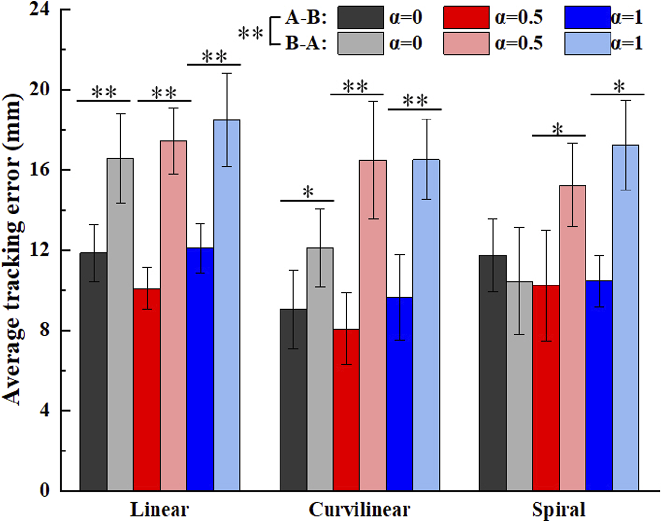 Figure 13 shows the average tracking errors on three types (linear, curvilinear and spiral) of target trajectories with three kinds of challenge levels (α = 0, 0.5, 1) in forward (A-B) and backward (B-A) movements. The Kruskal-Wallis H test illustrated that there was significant difference between the forward (A-B) and backward (B-A) movements (p < 0.01), but not differences displayed among the three types of tracking trajectories. For challenge levels α = 0, α = 0.5 and α = 1, two kinds of tracking errors in A-B and B-A movements were 11.9 ± 1.4 mm and 16.6 ± 2.2 mm, 10.1 ± 1.0 mm and 17.4 ± 1.7 mm, and 12.1 ± 1.2 mm and 18.5 ± 2.3 mm on linear trajectory, 9.0 ± 1.9 mm and 12.1 ± 1.9 mm, 8.1 ± 1.8 mm and 16.5 ± 2.9 mm, and 9.6 ± 2.1 mm and 16.5 ± 2.0 mm on curvilinear trajectory, 11.7 ± 1.8 mm and 10.4 ± 2.7 mm, 10.2 ± 2.8 mm and 15.2 ± 2.1 mm, and 10.5 ± 1.3 mm and 17.2 ± 2.2 mm on spiral trajectory, respectively. The Mann-Whitney U tests further indicated that there were significant differences of the two kinds of tracking errors in A-B and B-A movements (p < 0.05) with exceptions of the two paired groups (curvilinear and α = 0, spiral and α = 1).