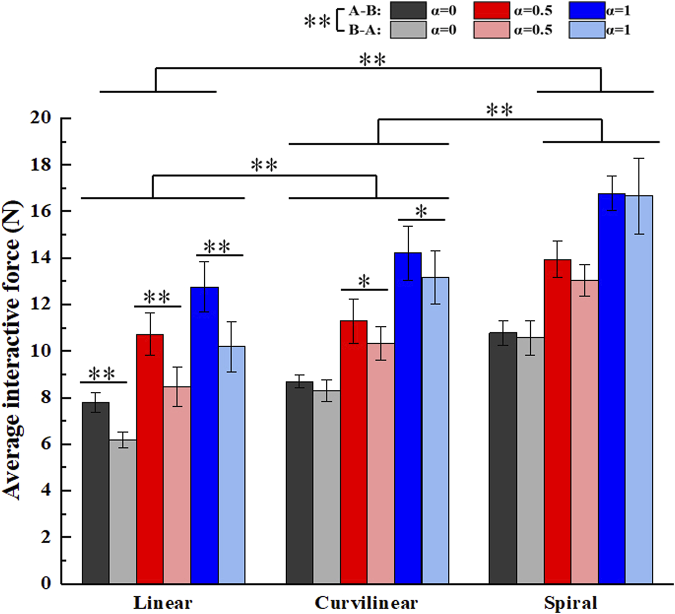 Figure 12 shows the trends of the interactive force on three types (linear, curvilinear and spiral) of target trajectories with three levels of challenge levels (α = 0, 0.5, 1) over the sequential tracking (forward (A-B) and backward (B-A)) movements. With the increase of the tracking trials, the interactive forces based on three levels of challenge levels displayed consistent upward trends in the forward (A-B) movements and downward trends in the backward (B-A) movements, separately. For challenge levels α = 0, α = 0.5 and α = 1, the upward slopes of the force trend were 0.379, 0.297, and 0.008 on linear trajectory, 0.380, 0.307, and 0.077 on curvilinear trajectory, and 0.275, 0.176, and 0.009 on spiral trajectory, in the forward (A-B) movements, respectively. Accordingly, the downward slopes of the force trend were −0.080, −0.276 and −0.366 on linear trajectory, −0.095, −0.234 and −0.382 on curvilinear trajectory, and −0.046, −0.193 and −0.524 on spiral trajectory, in the backward (B-A) movements, respectively.