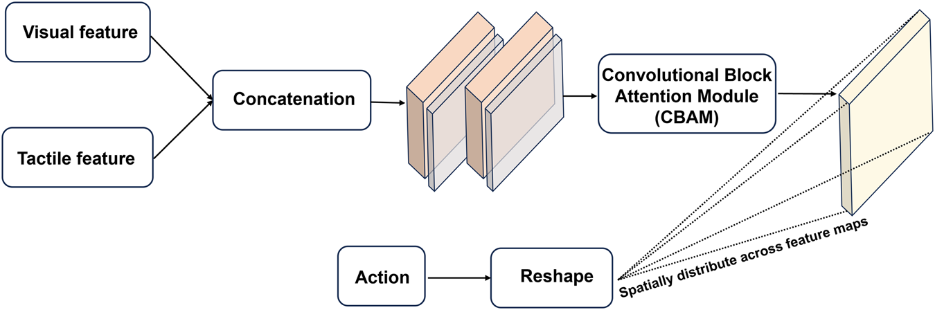While both vision and tactile data are represented as image sequences, there is still inherent modality difference between them. In latent space, the compressed feature for each modality contains the distinct characteristics of the original sensory source, and simple concatenation is insufficient to obtain complementary information capture the complementary information they provide. Therefore, it is crucial to use a proper fusion mechanism which is able to resolve the heterogeneity as well as efficiently extract the correlation between vision and touch. Figure 2 illustrated the internal framework of the multi-modal fusion module, which takes the latent values of vision and touch as input to learn a shared representation of two sensory modalities, as well as combining robot action data to form the integrated features for prediction. The vision and tactile data are concatenated in the channel dimension before fed into a layer of Conv-LSTM followed by a cross-modality attention block. Compared to simple concatenation, the use of Conv-LSTM reserves the spatial-temporal dynamics of the integrated data, which is crucial for handling the sequential data. In addition, we use the Convolutional Block Attention Module (CBAM) that generates attention maps along both the channel and spatial dimensions before multiplied with the input (Woo et al., 2018). The attention mechanism applied to the combined vision-tactile features enhances the model performance as it allows the model to selectively focus on the information that is more relevant to the formulated prediction problem, enabling more effective representations of the multi-modal features. Unlike vision and tactile data, the raw data of robot action is a 1-dimension vector that contains six position values related to the end-effector. Therefore, preprocessing is required to match the unaligned sensory data in different domains. The action data is first expanded to contain two extra dimensions as the vision-tactile data. Then the reshaped action data is broadcasted across the spatial extent of the vision-tactile feature map before concatenation in the channel dimension (which is achieved by replicating the action values along the newly introduced dimensions to ensure compatible size with the vision-tactile features). The combined feature is then fed in to a CNN layer to be reweighted with learnable coefficient.