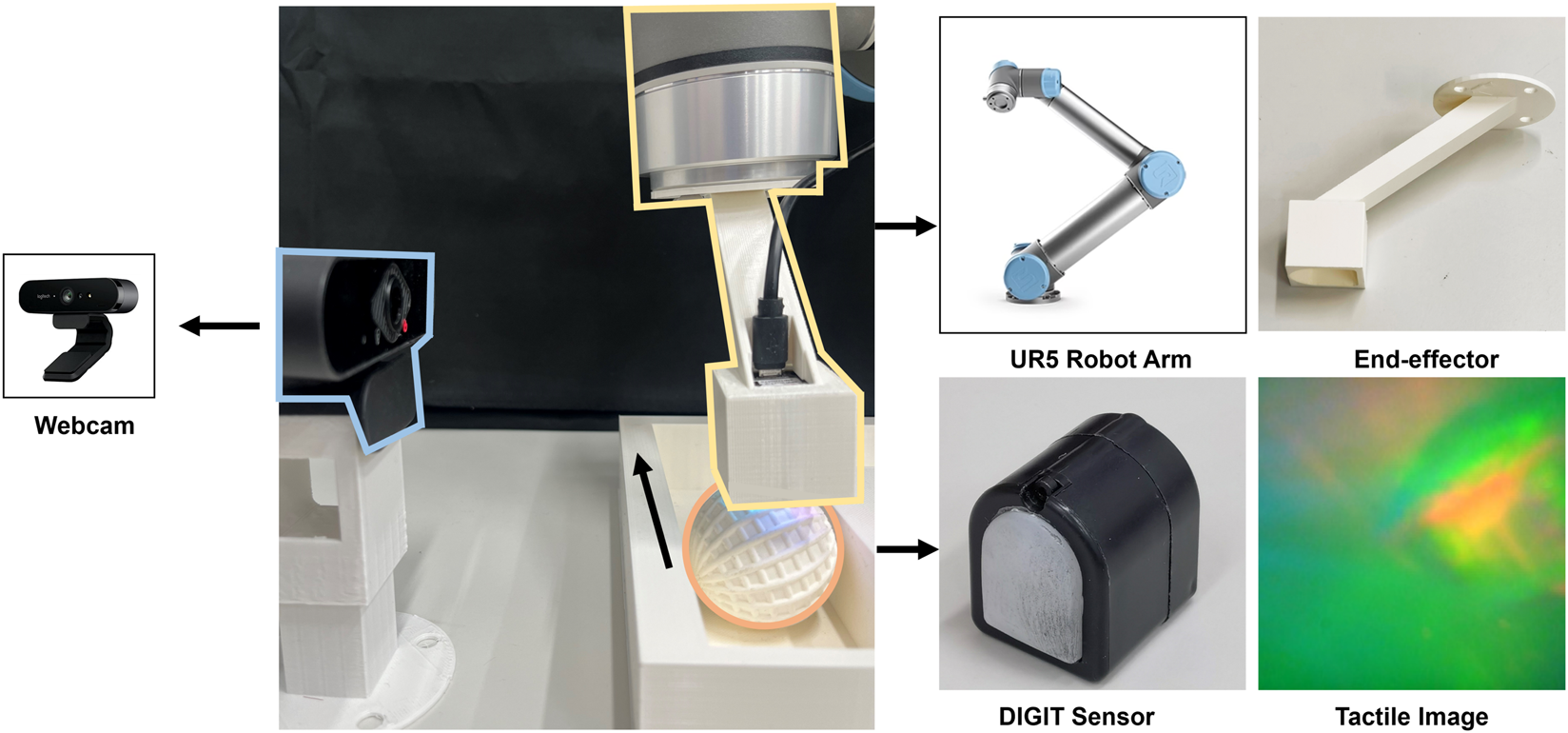 Experiment setup: the interaction system consists of a UR5 robot arm that is equipped with a DIGIT tactile sensor to collect the contact information. A webcam is set aside to capture the visual scene of the physical interactions. The graphs on the right show the details of the 3D-printed end-effector and the sample images of the vision-based tactile sensor.