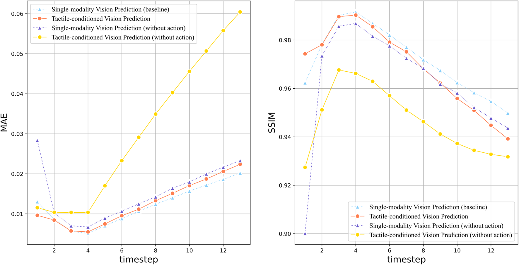 Quantitative evaluation of tactile-conditioned vision prediction over the long time horizon:the line plots illustrate the performance comparison between models with different sensation combination, including the tactile-conditioned vision prediction model (red line), single-modality baseline model (blue line), and their counterparts without action data (yellow/purple line). The graph on the left shows the MAE value of each model over 14 time steps, indicating the prediction accuracy. And the graph on the right compares the Structural Similarity Index Measure (SSIM) of the models.