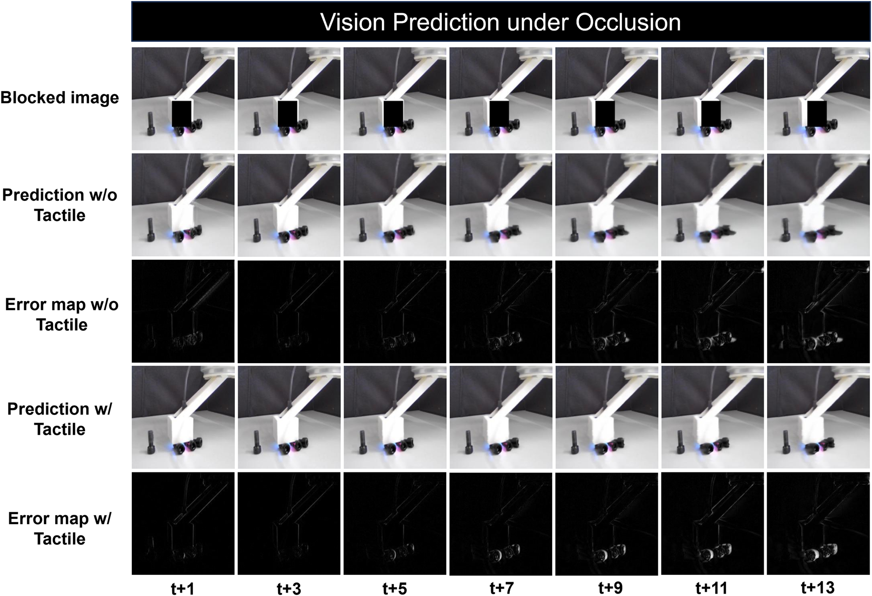 Qualitative results of vision prediction under occlusion: The first row shows the processed vision data with blocked contact area. Predictions with and without tactile sensation are shown at every three time steps from t+1 to t+13, the 3rd and 5th row shows the error map with pixel-wise difference between the prediction and the ground truth.